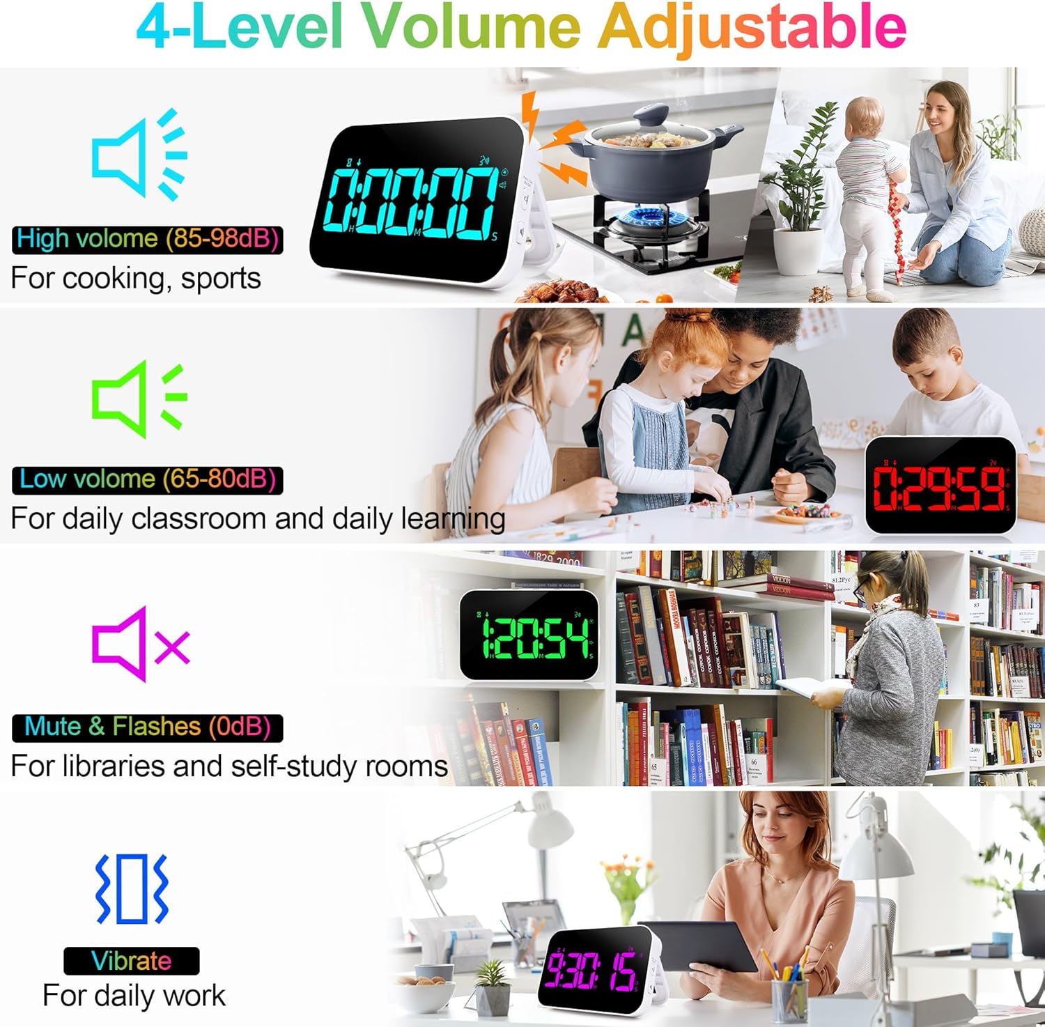 - 3 BRIGHTNESS AND 4 VOLUME ADJUSTABLE:This productivity timer features 4 reminder volumes: Mute (0 dB), Medium (60-75 dB), High (80-90dB) and vibration, you can choose the volume mode according to different usage scenarios.In addition, the kids timer also has 3 brightness modes adjustment: high, low and energy saving, so you can choose the brightness mode according to different usage scenarios (Note: energy saving mode makes the screen go to sleep after 10 seconds)