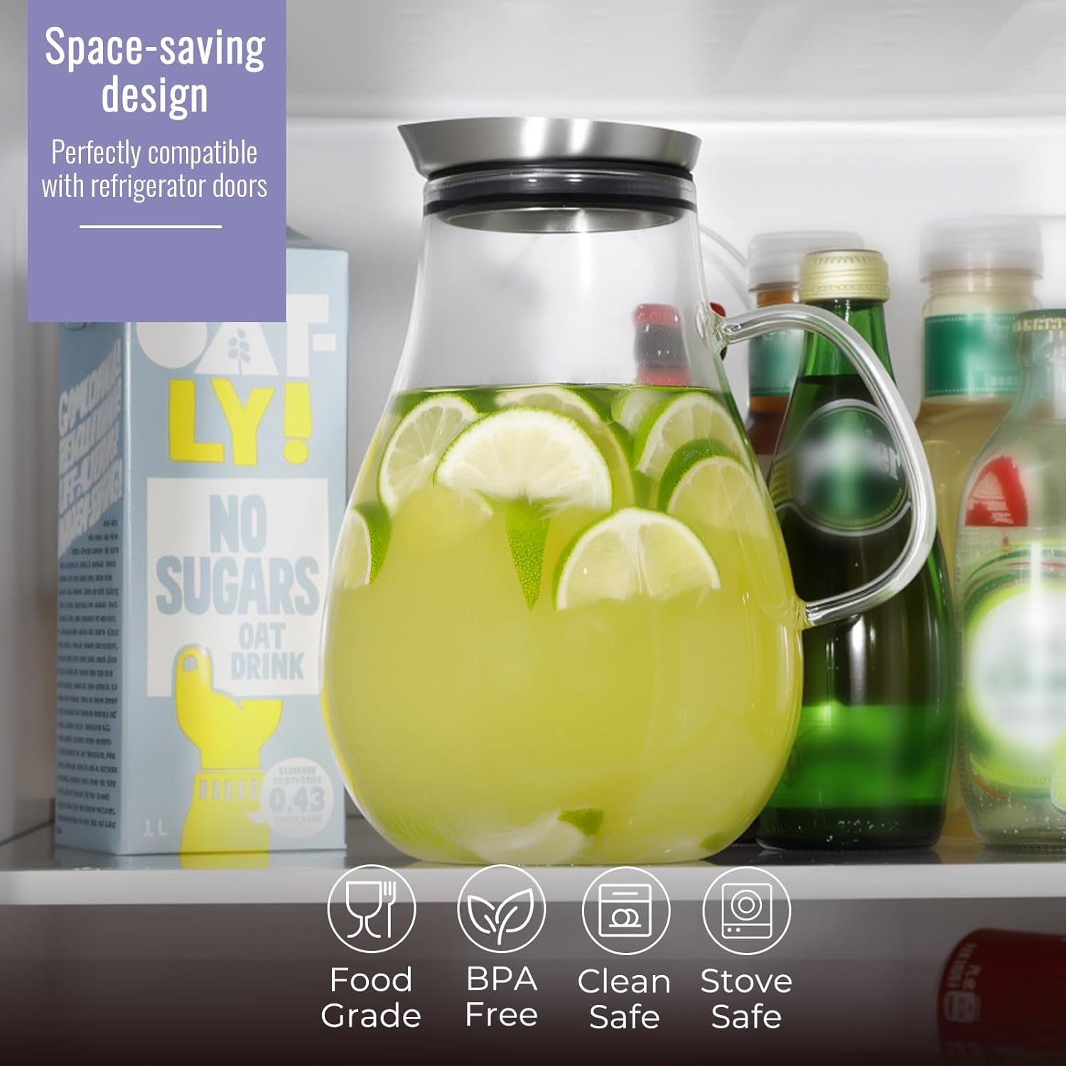 - Perfectly Sized Capacity: With a generous 1.5Liter or 51oz capacity glass pitchers with handle and lid, it is ideal for serving homemade iced tea, juice, sangria, cocktails, coffee, or milk. Whether you're hosting a party, enjoying a picnic, or need a stylish glass water pitcher for your bar, the leak-proof glass jug has got you covered.