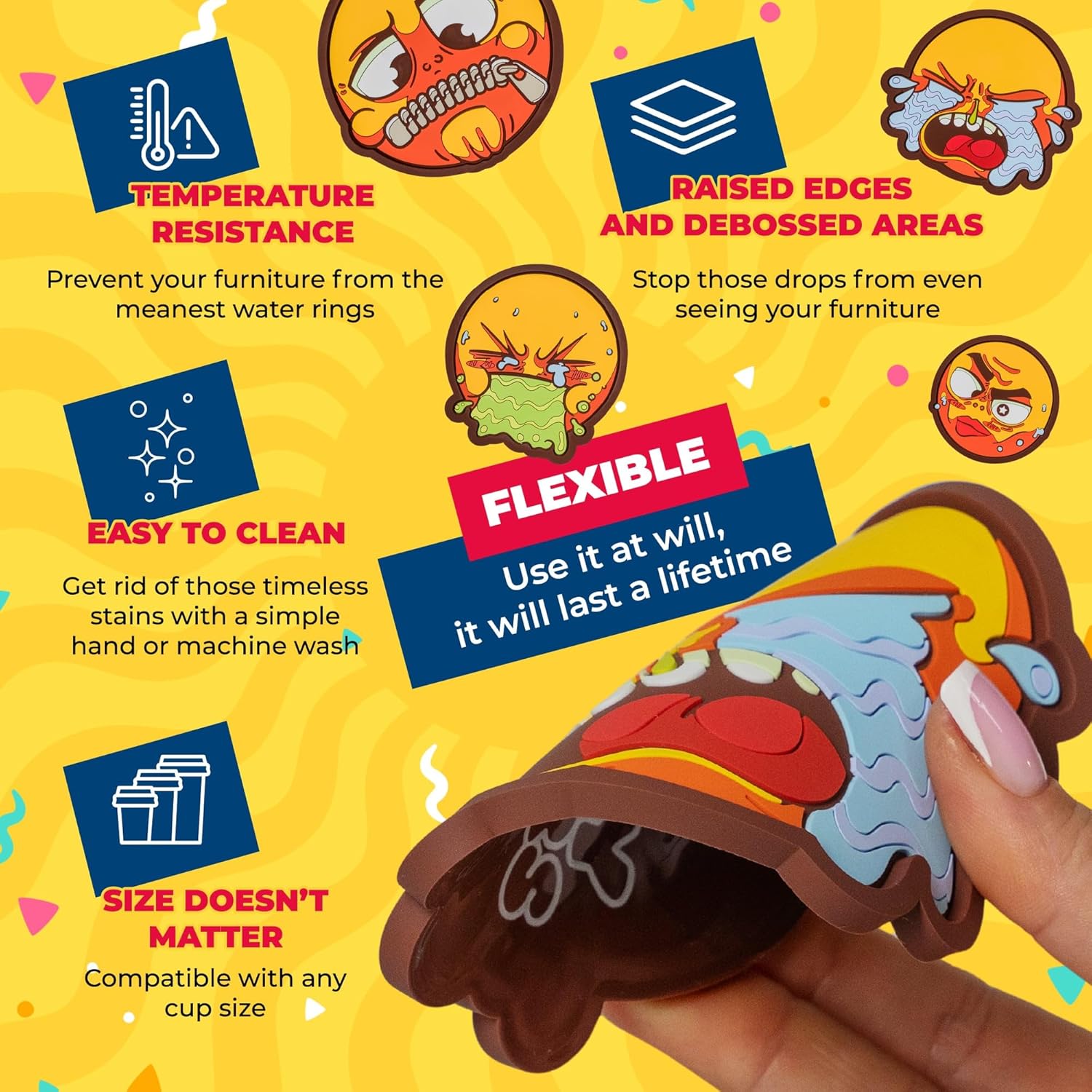- Does This Even Work Properly? - Our coasters feature Hot and Cold Drinks Resistance for Furniture Protection, Raised Edges and Debossed Areas for Condensation Capturing, Dishwasher Safe and Easy to Clean by Hand for a Stain Free Design, Non-Slip Bottom for Cup Support Anywhere, Flexible for Long Term Use, Compatible with Any Cup Size from Coffee to Wine, Beer, and much more.