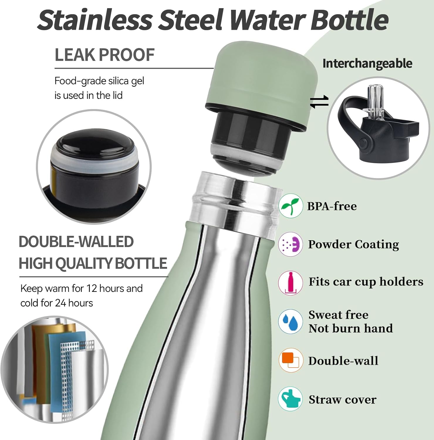 - COLORFUL & UNIQUE:Powder coating is the pinnacle of water bottle exteriors. Choose from a range of vibrant colors to match your personality and style. The Stainless Steel Metal water bottle is crafted with fashionable color powder coating, will not be scattered, discolored and difficult to scratch. Available in 9, 12,and 17-ounce sizes,making it easy to find the perfect size for your needs.