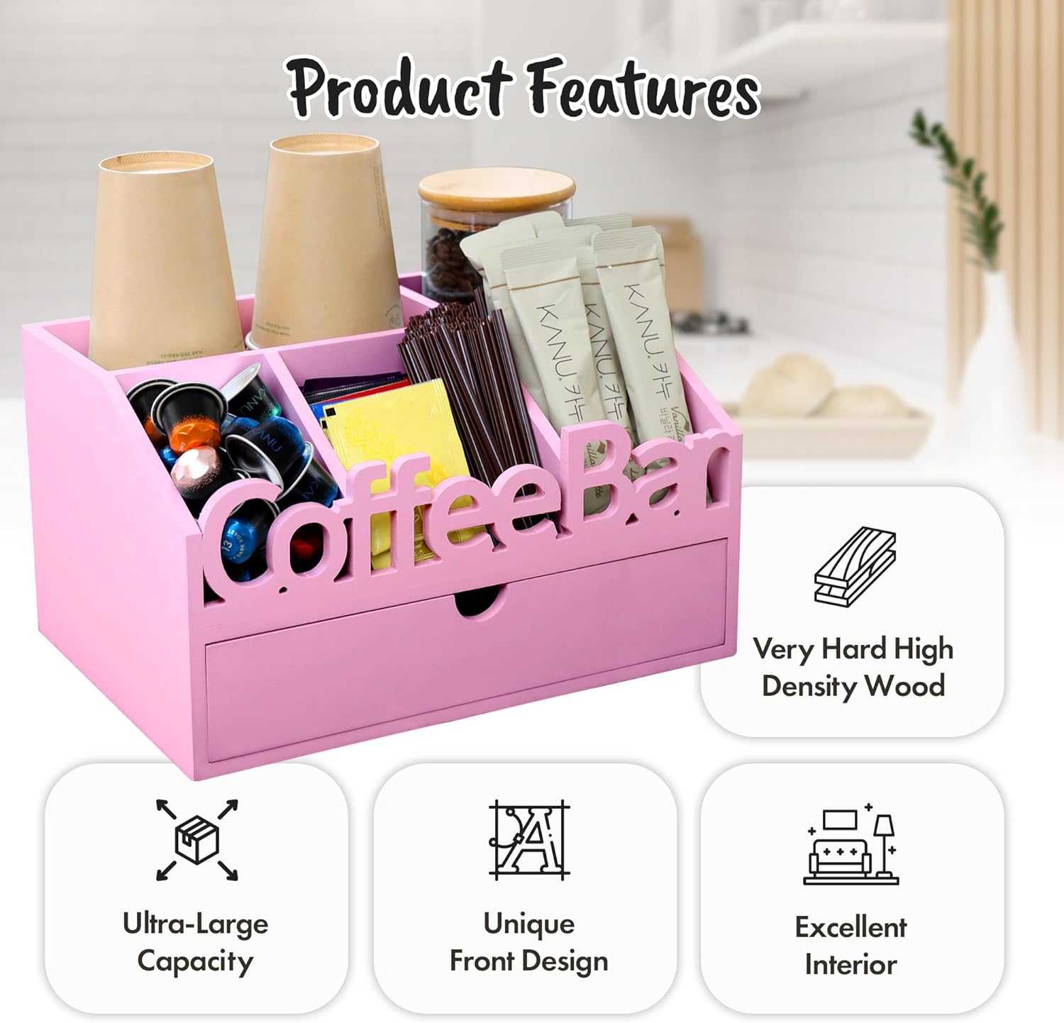 - MULTIFUNCTIONAL DESIGN: This coffee organizer station for countertop includes a drawer for extra storage, making it a coffee drawer organizers and storage solution. Use it to store your coffee pods, tea bags, stir sticks, and more.