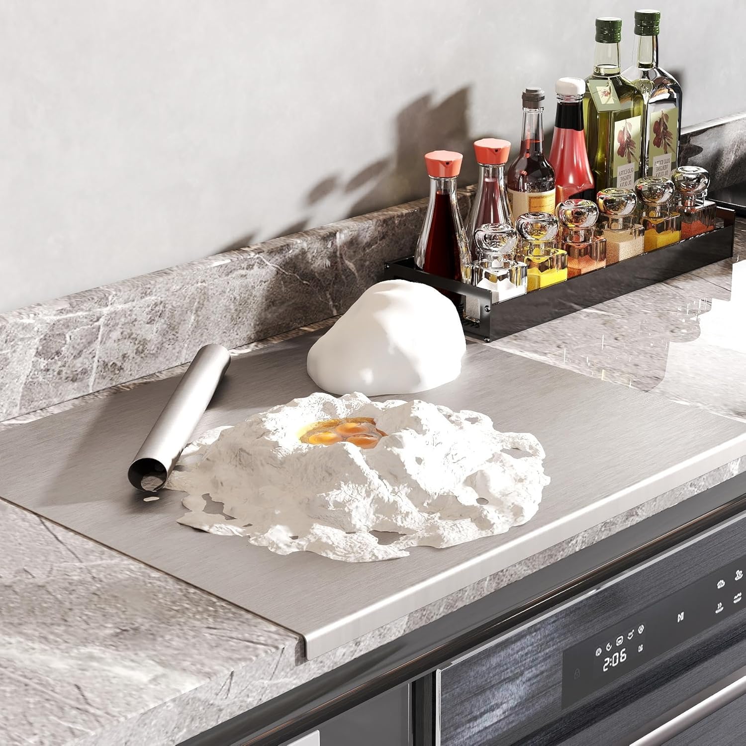 - HEAVY-DUTY AND NON-SLIP DESIGN: With a heavy-duty construction, the 304 stainless steel cutting and chopping board features a straight edge that forms a perfect 90° angle with countertops, ensuring stability and preventing slipping. This design allows for precise cutting and chopping, making it an essential tool in any kitchen.
