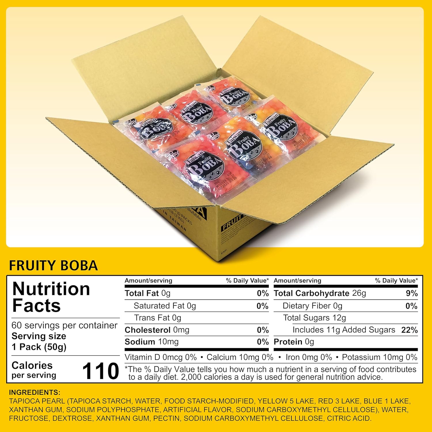 - BOBA - WHAT IS INSIDE - 60 Pack of 5 Individually wrapped portions of Fruity flavored boba. Unopened packs have a shelf life of up to 1 year in a cool, dry place (no refrigeration necessary).