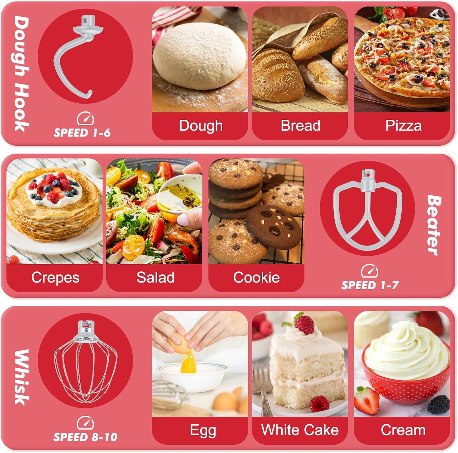- Upgraded Accessories and Dishwasher Safe- Aluminium dough hook and flat beater with protection layer,stainless steel whisk are all easy to attach,more sturdy and durable. The stainless steel bowl and all accessories are dishwasher-safe for effortless cleanup.