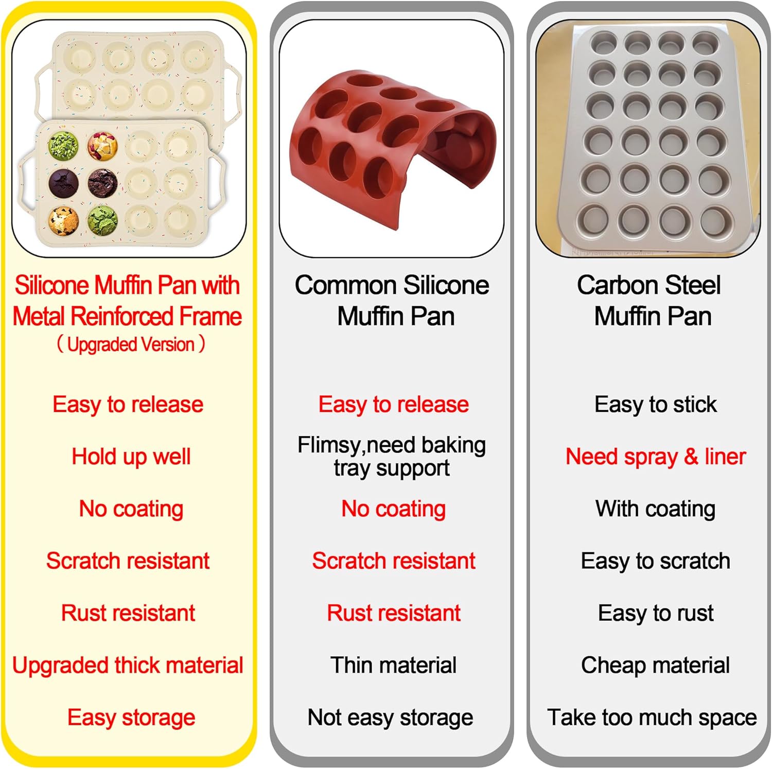 - Sturdy Metal Reinforced Frame: Each silicone muffin pan with an embedded metal-rimmed handle on both ends for easier use. Unlike muffin pan without handles and metal rims, this muffin tin boasts a stable frame and does not require a pan underneath for support. The metal frame to prevent the silicone from collapsing. sturdy to use for filling and baking with ease due to their structure! When not in use, the kitchen baking pans can be stacked together to save space, providing you with a reliable baking tool for countless occasions