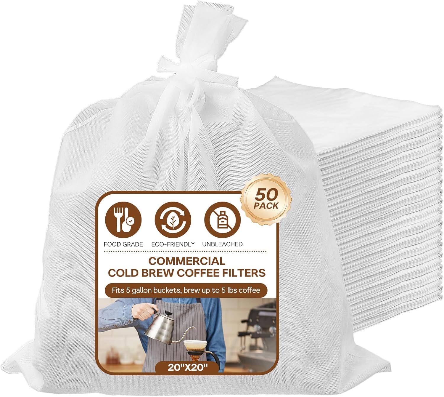 50Pcs Commercial Cold Brew Coffee Filters for 5 Gallon Buckets, 20" X 20" Disposable Coffee Filters with Drawstring for Brew Up To 5 LBS Coffee