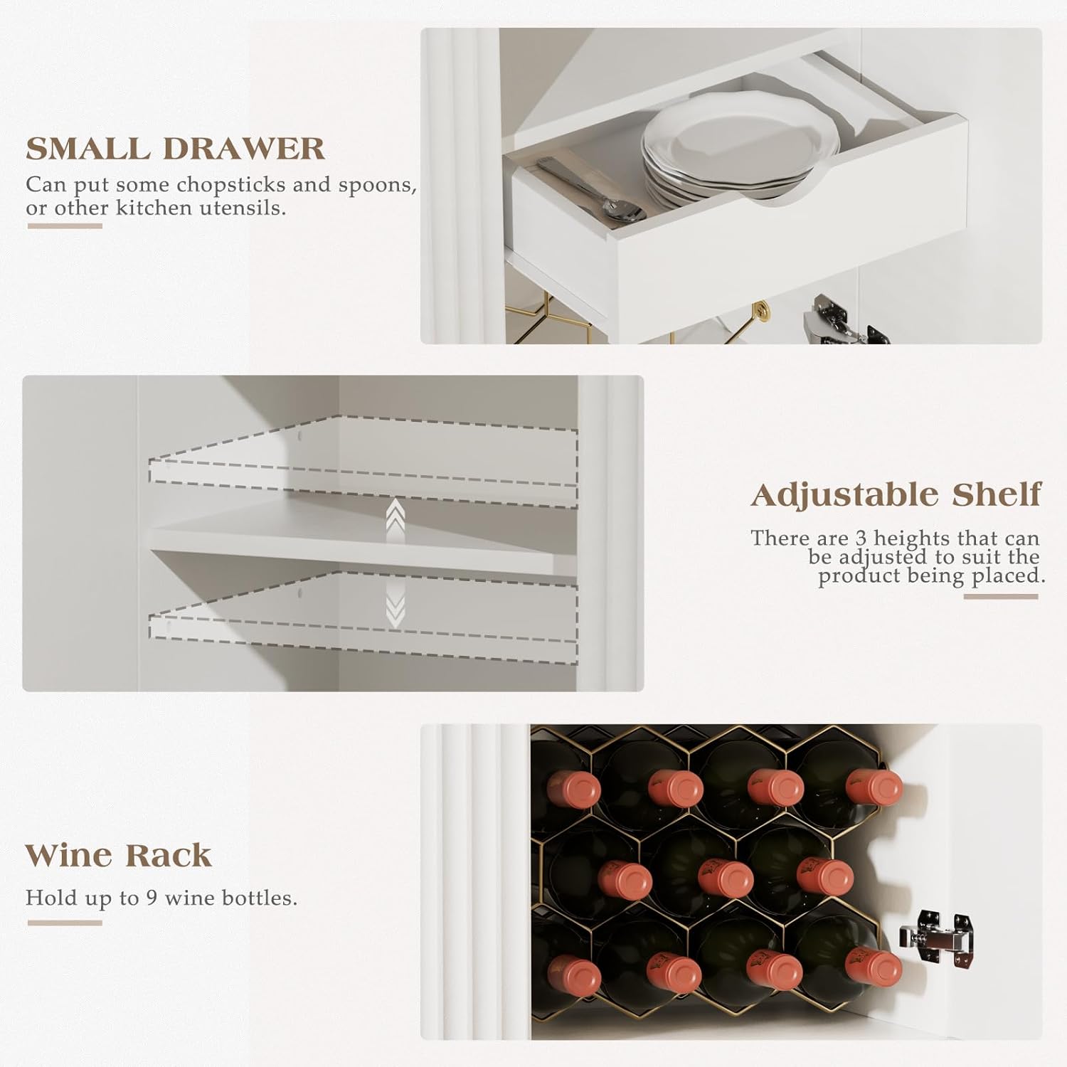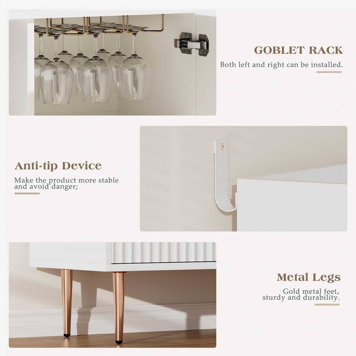 EOYUTLLY Coffee Bar Cabinet with Wine Rack & Glass Holder, Kitchen Sideboard Buffet Cabinet with Storage,Wine Bar Cabinet with Fluted Doors for Living Room Dining Room,White
