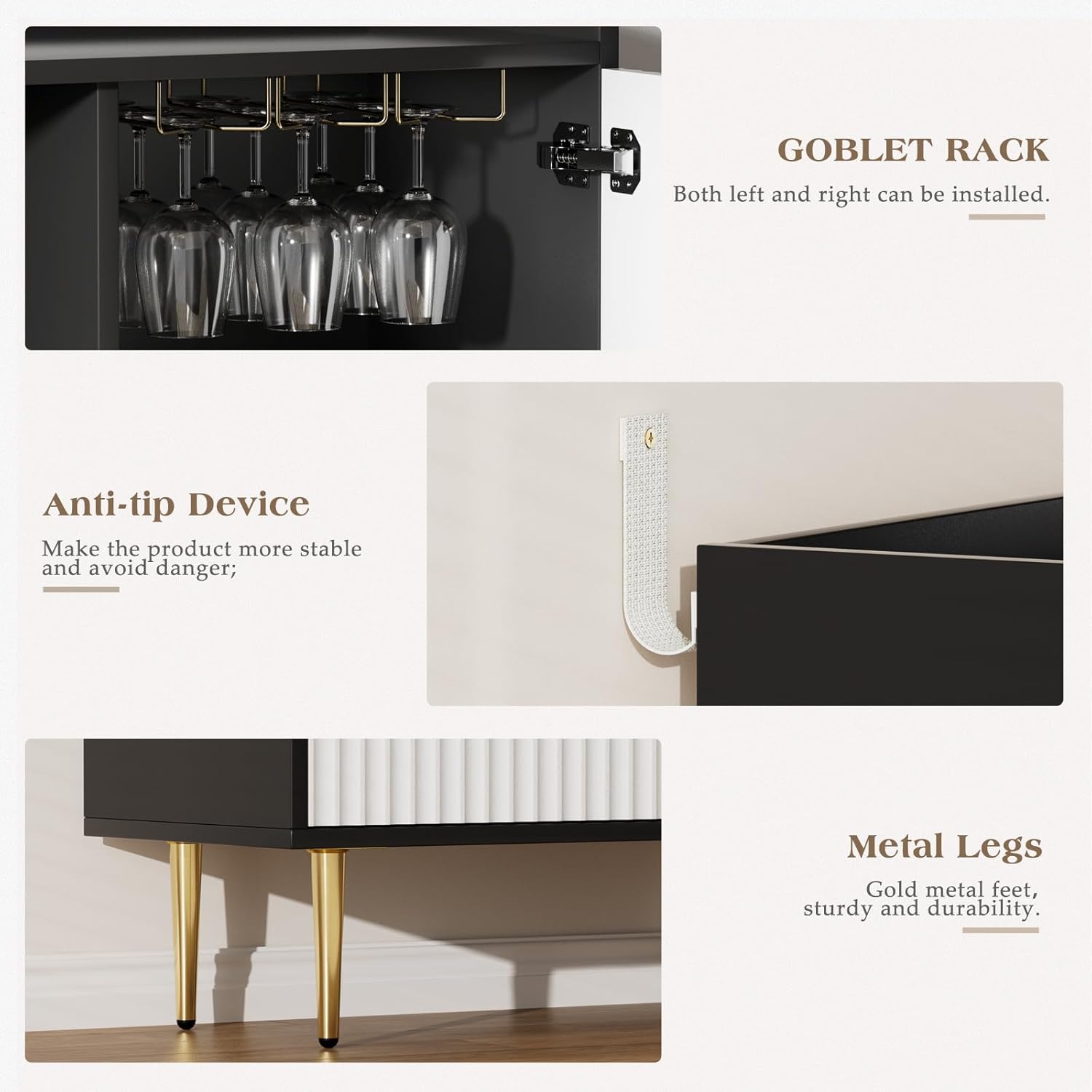 - Fashionable and Beautiful: EOYUTLLY liquor cabinet with 2 black fluted textured doors, gold metal handles and legs, Whether it's in your living room, dining room or kitchen, it blends in perfectly with the rest of your decor, providing storage space and a sleek, beautiful look for your room
