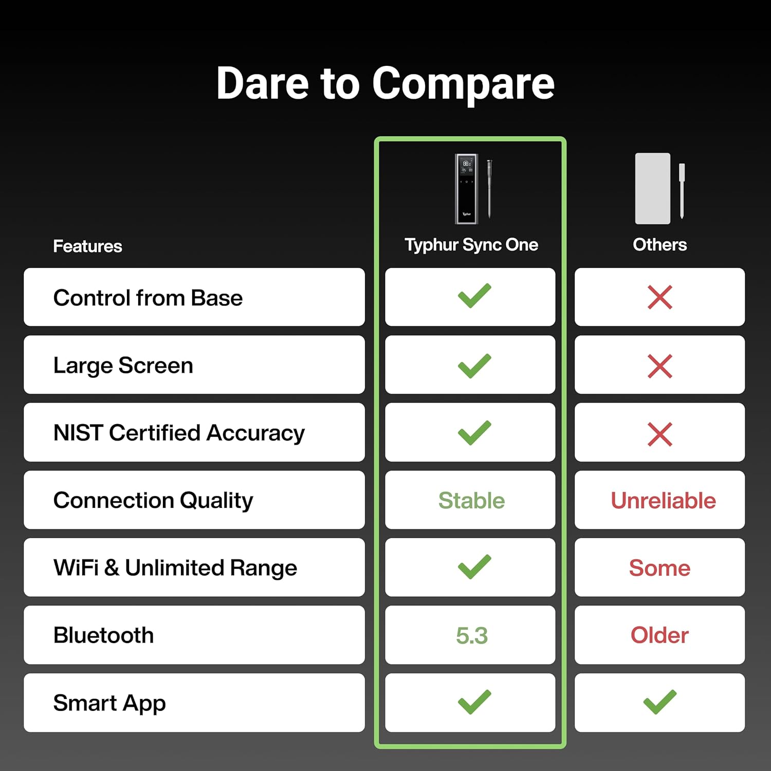 - Included Components : Typhur Sync Device Base x 1, Meat Probe x 1, Charging Cable x 1, User Manual x 1