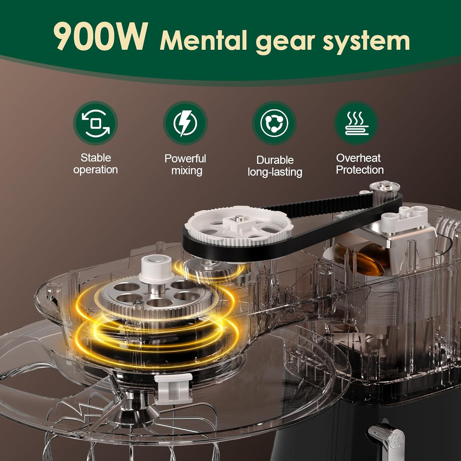 - Powerful Motor - 900W upgraded high speed motor, faster completion of various cooking, more even and full mixing. Long-term rotation without getting hot, extending the life of the electric stand mixer and improving safety.
