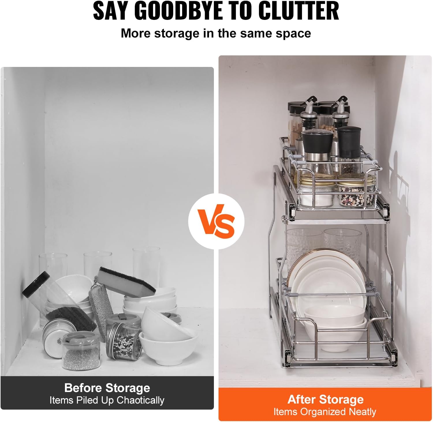 - Space Saving: The two-tier pull out cabinet organizer creates more storage space in cabinets, accommodating items like frying pans, spice jars, food cans, and cleaning supplies, greatly saving your storage space.