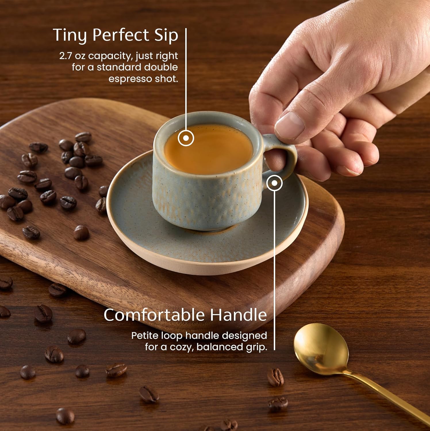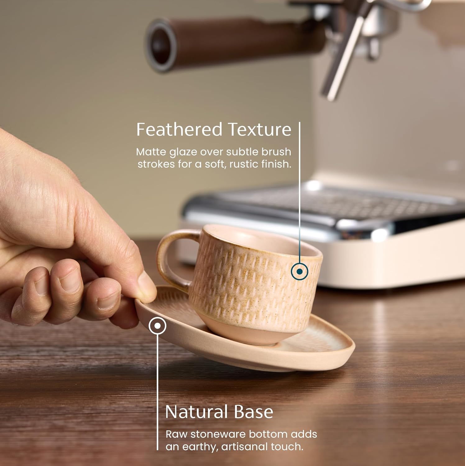 KooK Espresso Mug and Saucer Set, Ceramic Cups and Plates with Rustic Organic Shape and Feathered Texture, Dishwasher and Microwave Safe, 2.7 oz, Set of 4, Neutral Multicolor
