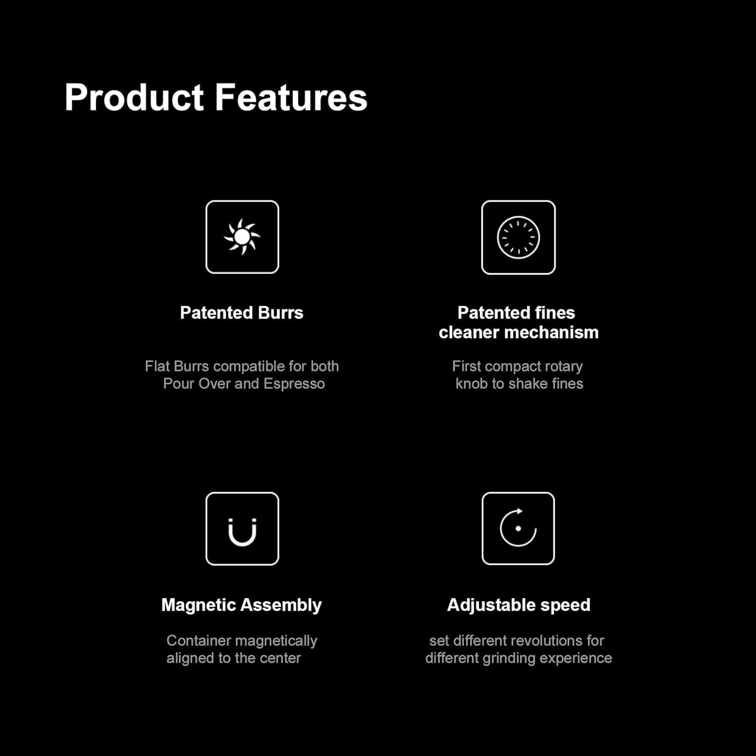- [ Adjustable 800-1200 RPM ] Fine-tune your brew, and achieve your desired flavor withadiustable RPM. lt's available to set different revolutions togive you different grinding styles so you can have a varietyof operations according to your preferences.