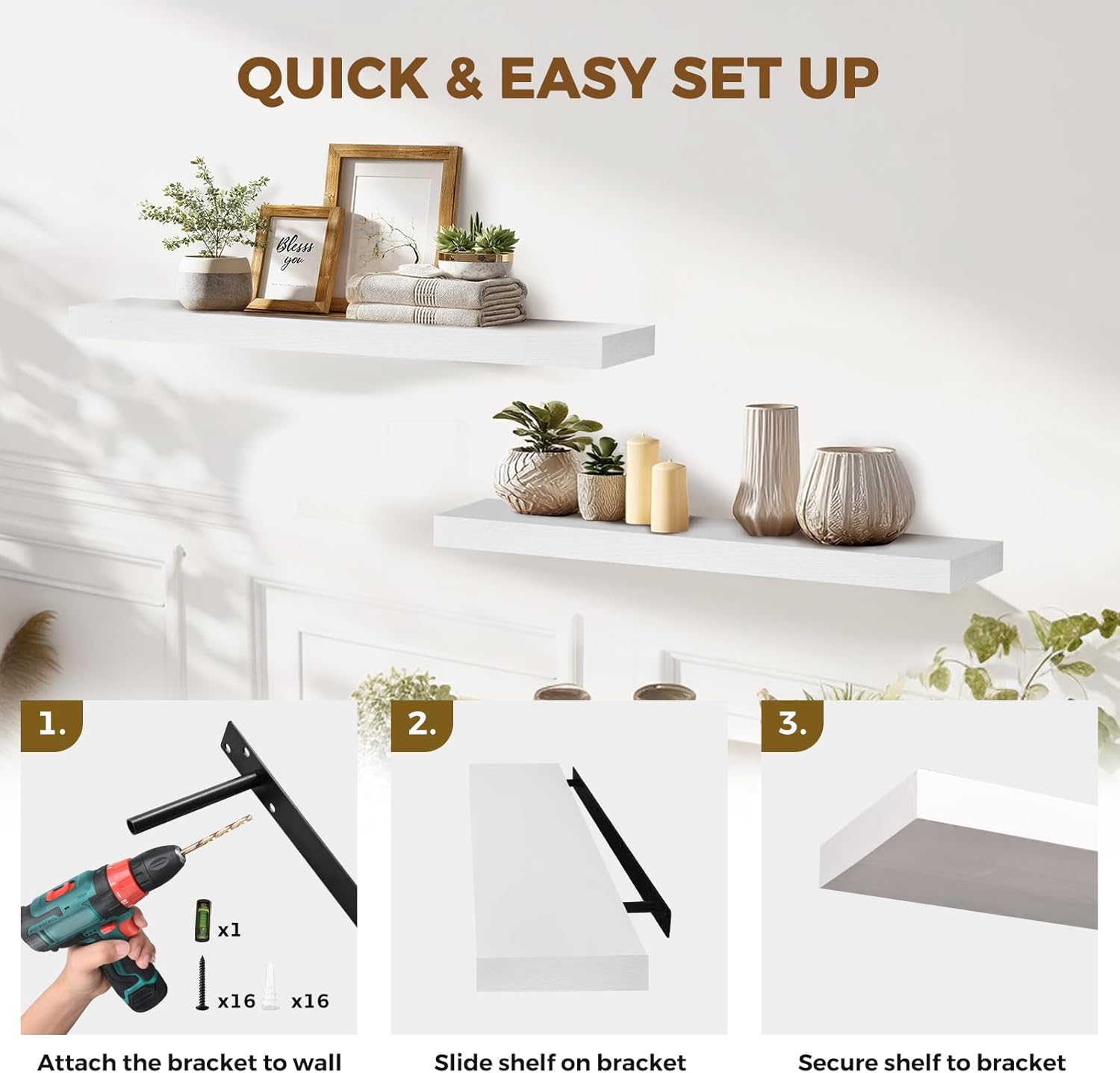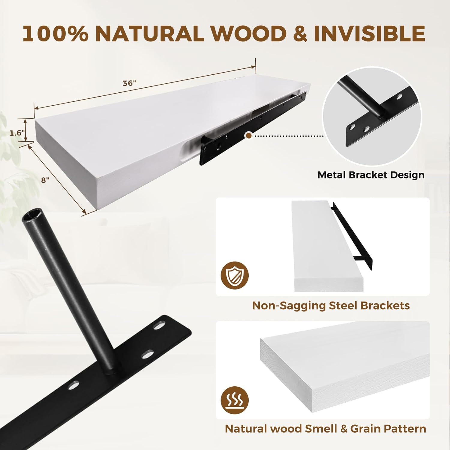36x8x1.6 inch Floating Shelves Set of 2 – Solid Wood Rustic White Wall Mounted Shelf for Kitchen, Bathroom, Living Room