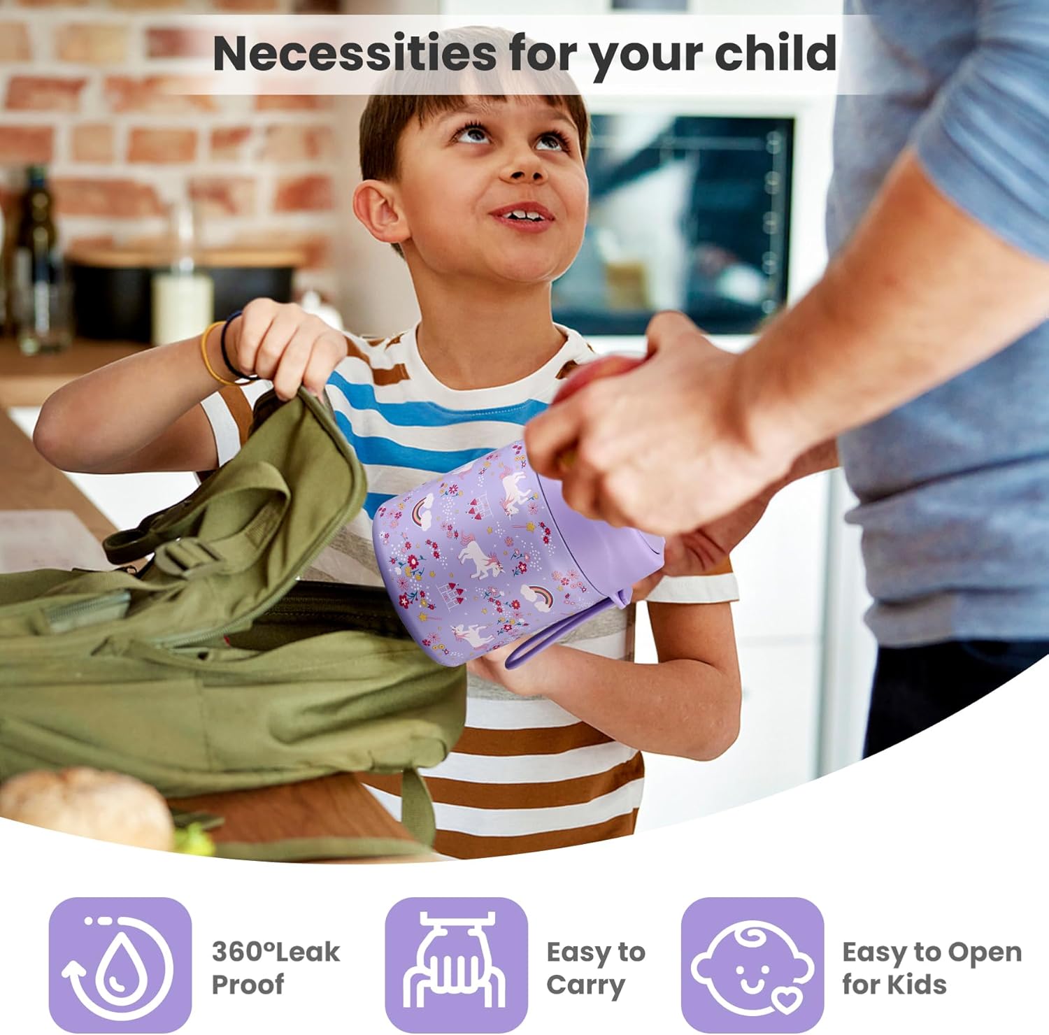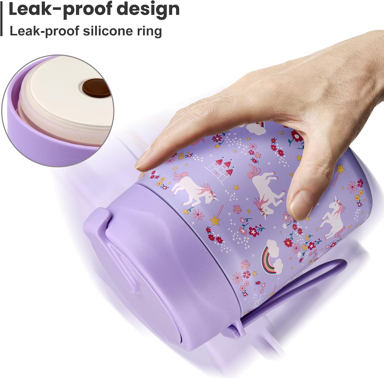 - Leak-Proof Design: Featuring an upgraded double-layer silicone seal that provides a 360° leak-proof guarantee. Rest assured that our leak-proof thermo food jar can fit in your lunch bag without worrying about spills. The insulated thermal food jar comes with a stainless steel spoon for your child's convenience.