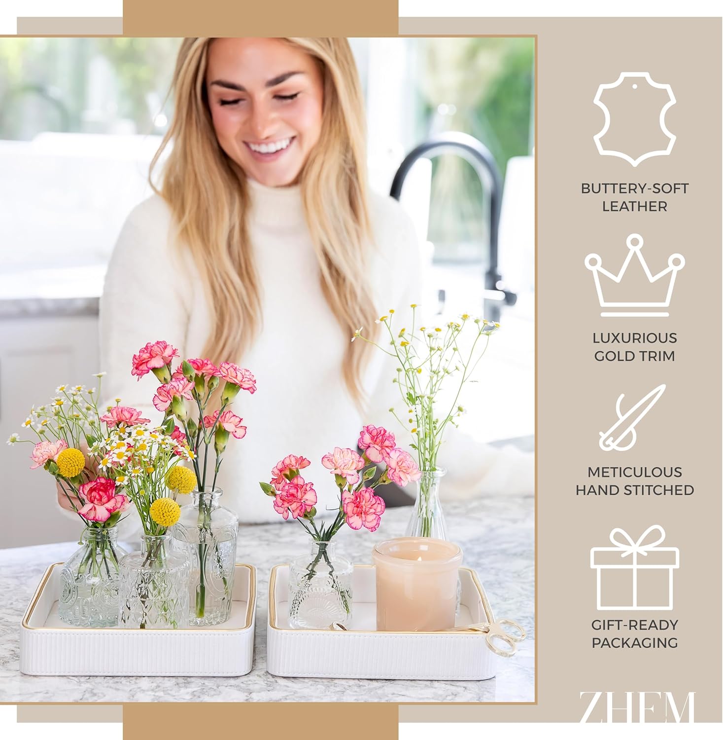 - 🎁 Melds with Your Interior Decor: Offered in timeless white and gray colors, our dump tray embraces versatility; This decorative vanity tray for nightstand, sleek gold trim desk organizer will slip effortlessly into your existing home, adding a touch of refinement that complements your style. Whenever you consider upgrading your bedside decor, a decorative vanity tray, keys tray, or tray for keys, ZHEM brand is an excellent choice for you.