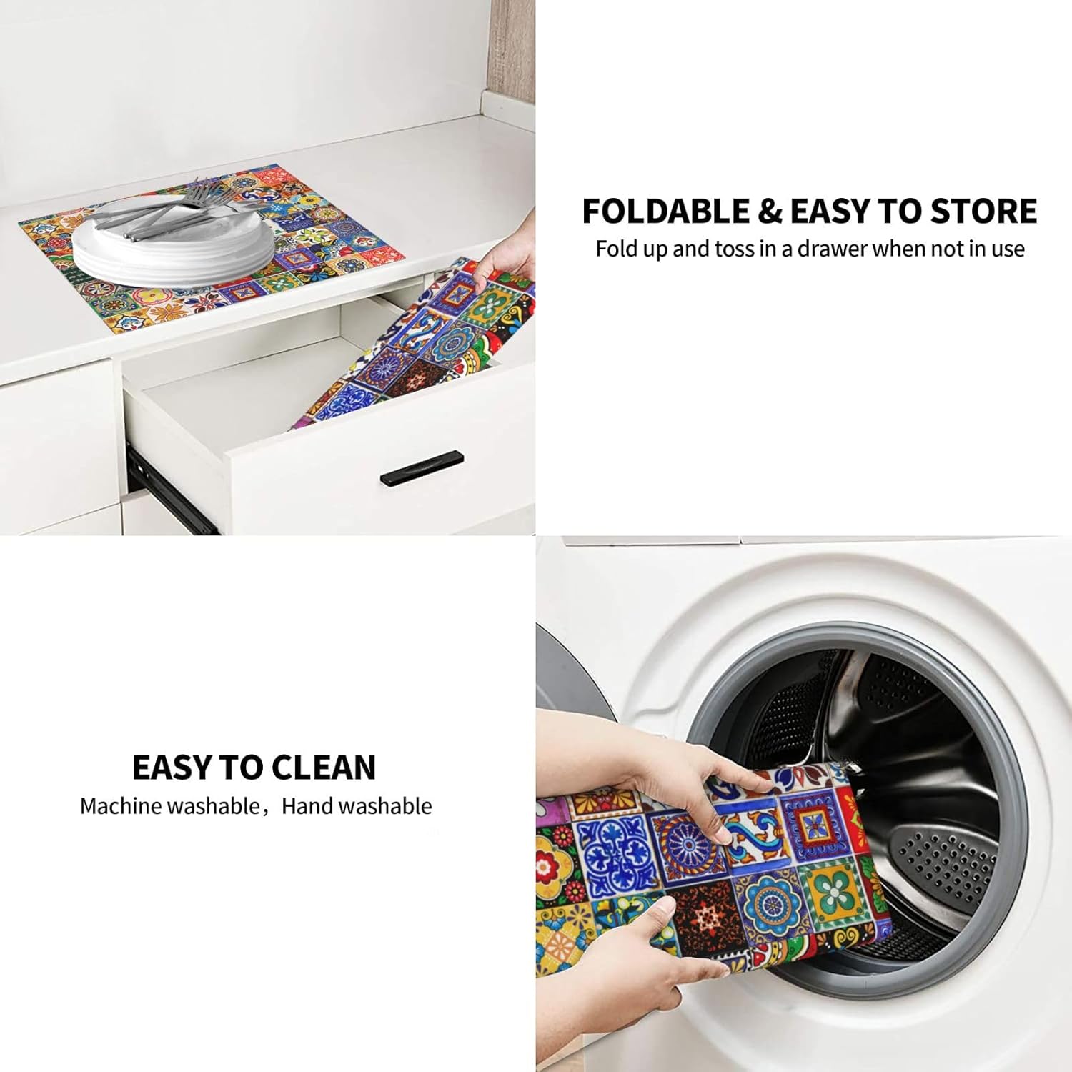 - Easy To Clean & Store -- The Drying Mat Is Machine Washable, Easy To Clean And Store. Fold And Slip Into A Drawer Or Cabinet When Not In Use. The Mat Can Also Be Hung On The Hook With The Tape