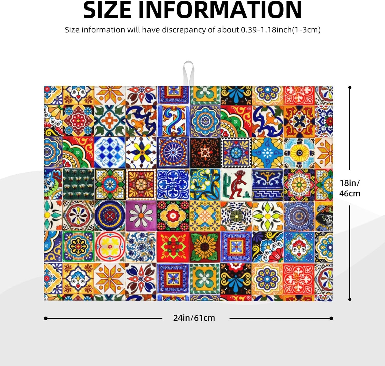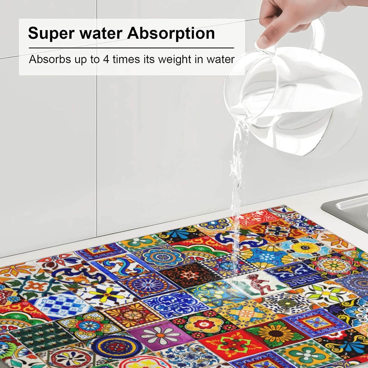 Bohemian Chic Floral Dish Drying Mat, Highly Absorbent Microfiber Kitchen Counter Pad Reusable Washable, 18*24"
