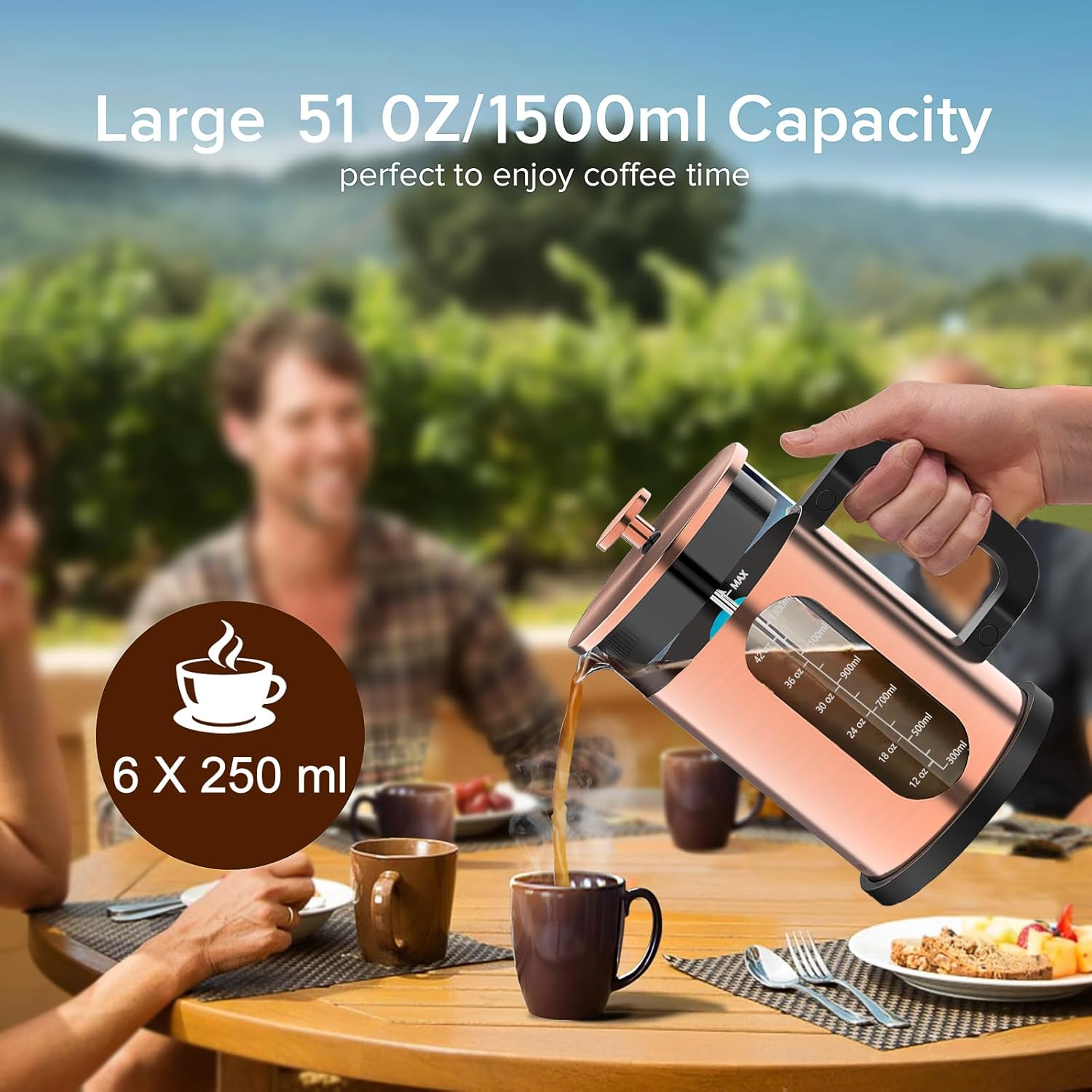 - 【EASY TO USE】Brew a cup of coffee in several minutes. The 51oz/1500ml french press makes the perfect cup of coffee. The french press coffee is the easiest to concentrate on the condition of the beans among the many devices. You can see the amount of foam (crema) after the coffee touches the water, and how the coffee floats on the water and slowly sinks