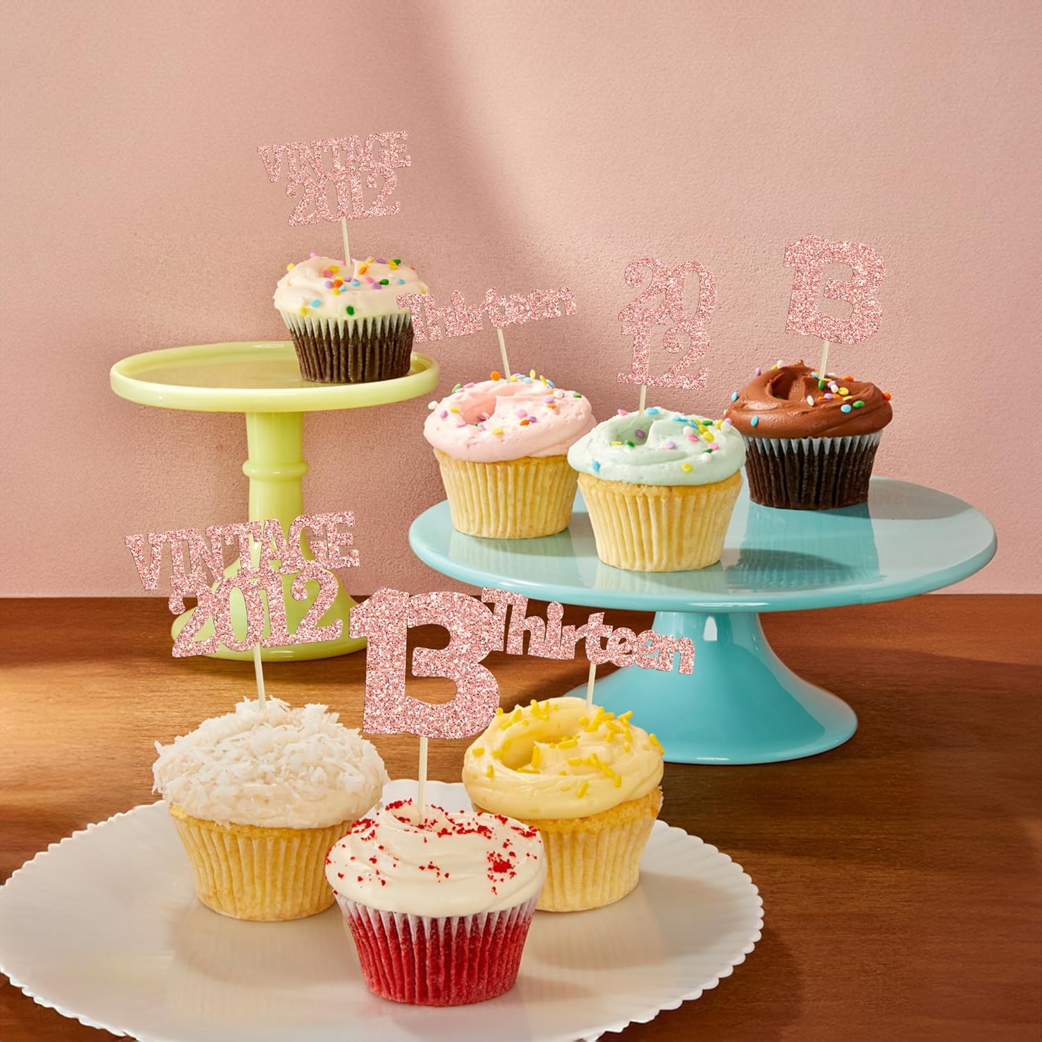 Gyufise 24Pcs 13th Birthday Cupcake Toppers Glitter Thirteen Vintage 2012 Hello 13 Years Birthday Cupcake Picks Official Teenager 13 Cake Decor for Happy 13th Anniversary Party Rose Gold