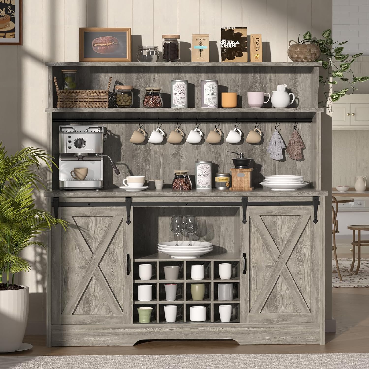 55'' Farmhouse Coffee Bar Cabinet with 3 Tier Storage Hutch, Coffee Bar Station with Sliding Barn Door, Hutch Storage Cabinet with 12 Wine Racks & 9 Hooks for Kitchen Dining Living Room