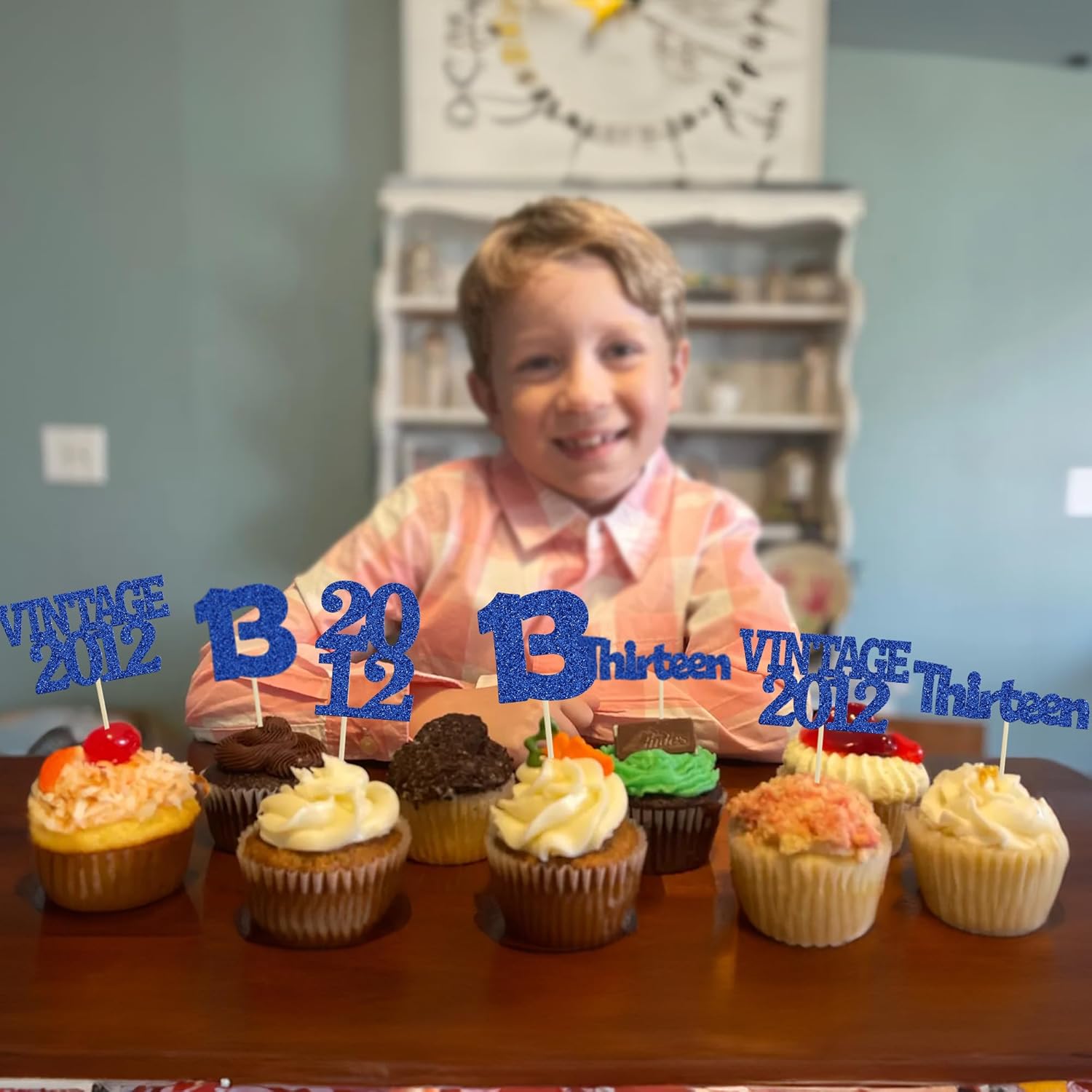 Gyufise 24Pcs 13th Birthday Cupcake Toppers Glitter Thirteen Vintage 2012 Official Teenager 13 Cupcake Picks Birthday Cake Decorations for Happy 13th Anniversary Party Supplies Deep Blue