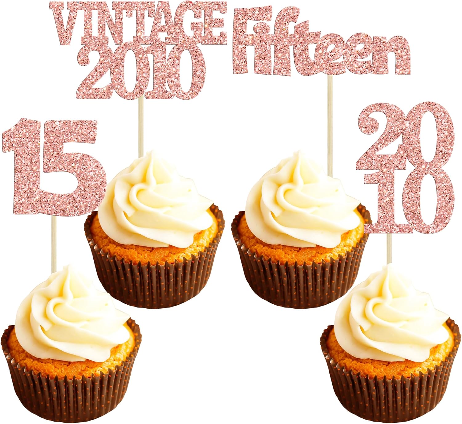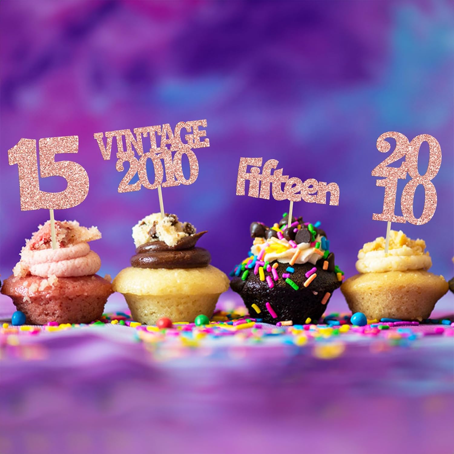 Gyufise 24Pcs 15th Birthday Cupcake Toppers Glitter Fifteen Vintage 2010 Hello 15 Years Birthday Cupcake Picks Sweet 15 Cake Decorations for Happy 15th Anniversary Party Supplies Rose Gold