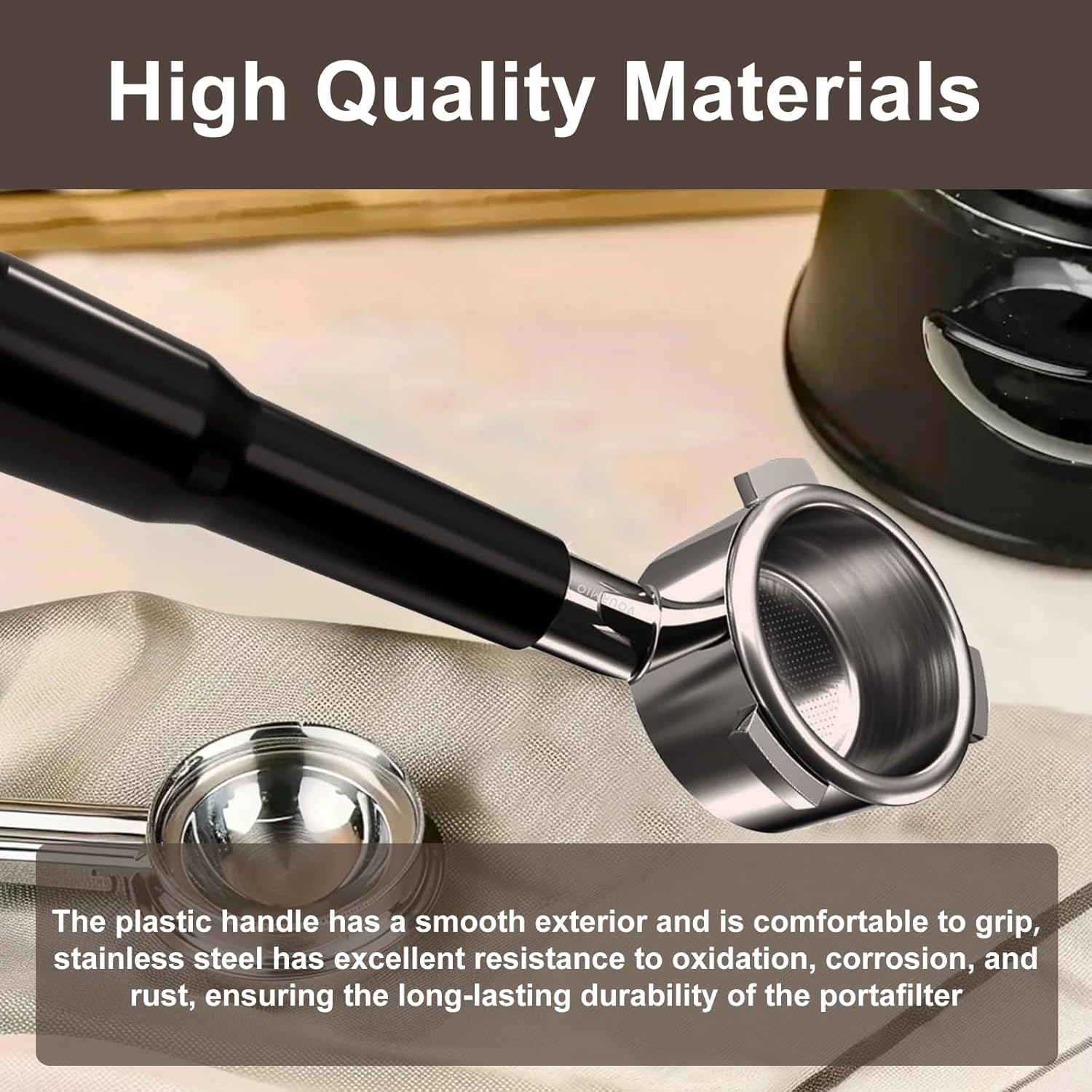 - HIGH-QUALITY MATERIALS - Crafted from food-grade stainless steel and featuring an ABS plastic handle, this portafilter combines durability with comfort. The ABS handle has a smooth exterior for a comfortable grip, while the stainless steel resists oxidation, corrosion, and rust, ensuring long-lasting performance