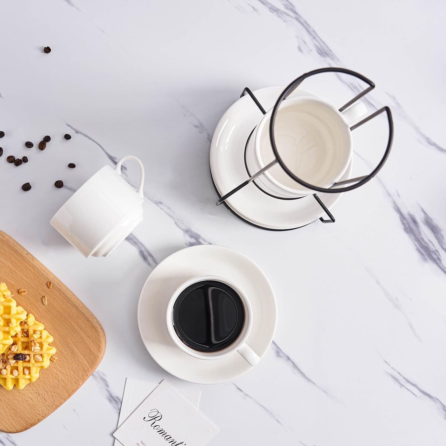 - 1. Elevate your kitchen experience with the YOLIFE Cappuccino Cups Set of 4. This set includes 4pcs 8 Ounce Cappuccino Cups with Saucers and Metal Stand, all in a classic ceramic white color. Perfect for people who enjoy coffee and conversation!