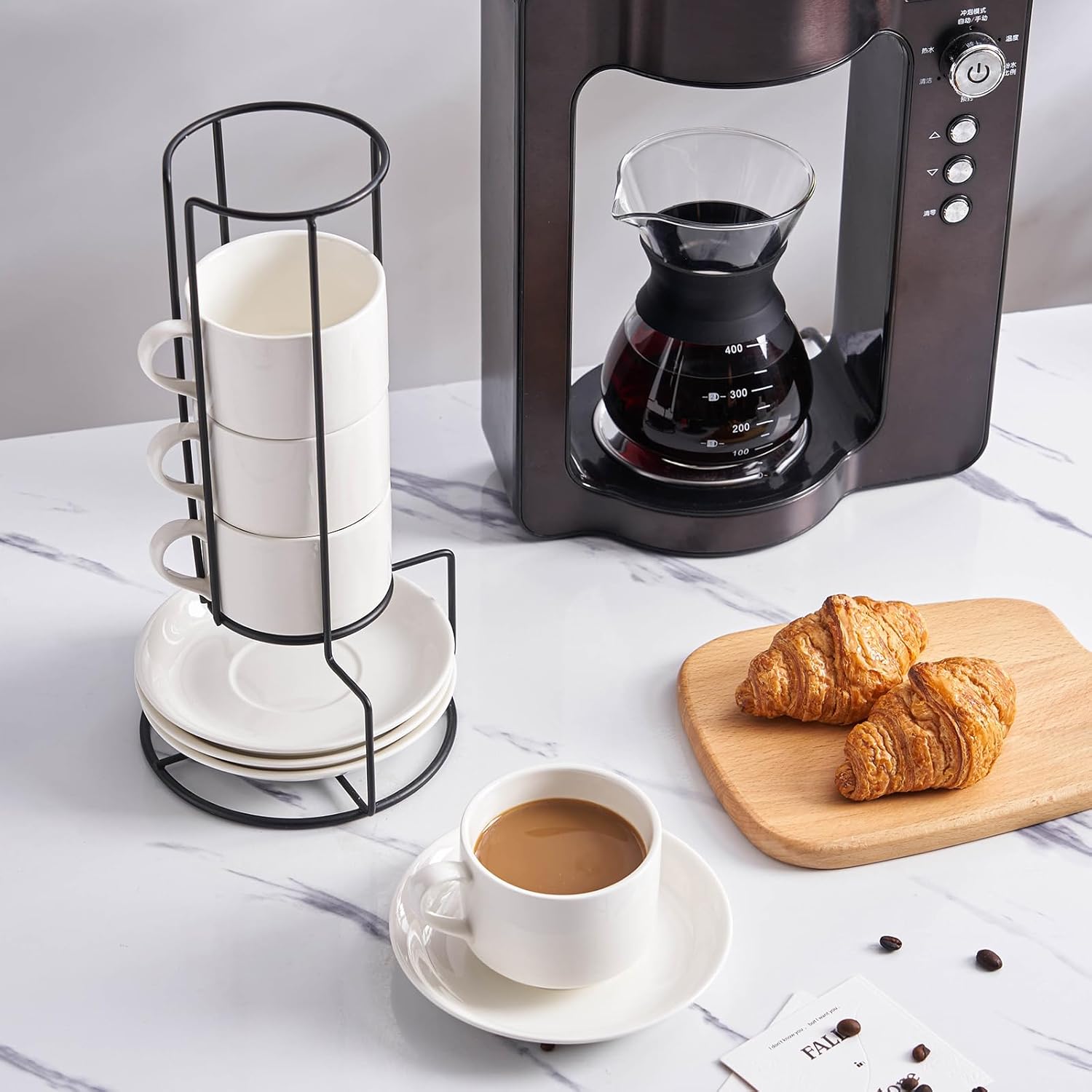 - 4. Experience the perfect blend of simplicity and sophistication with our 8 oz Espresso Cups. Designed to complement your espresso maker, they include saucers and a convenient stacking stand. The thick cup walls excel at heat retention, allowing you to savor your coffee.