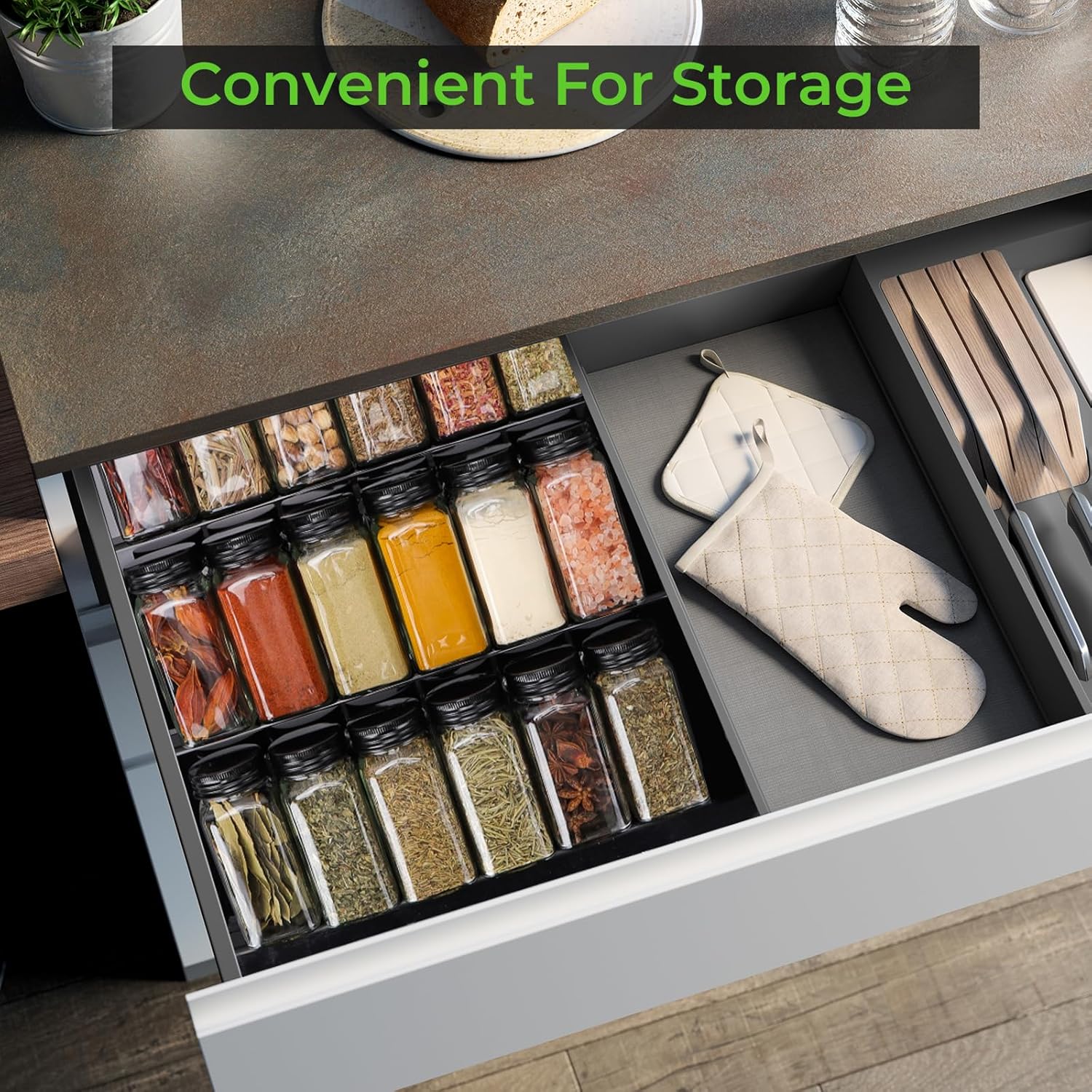 - MULTIFUNCTION : The modern design square shape and tops fit any spice rack, cabinet, organizer, drawers, or kitchen. Use our square glass jars for organizing drawers, seasoning, storing spices, salt, pepper, herbs, DIY projects, and more