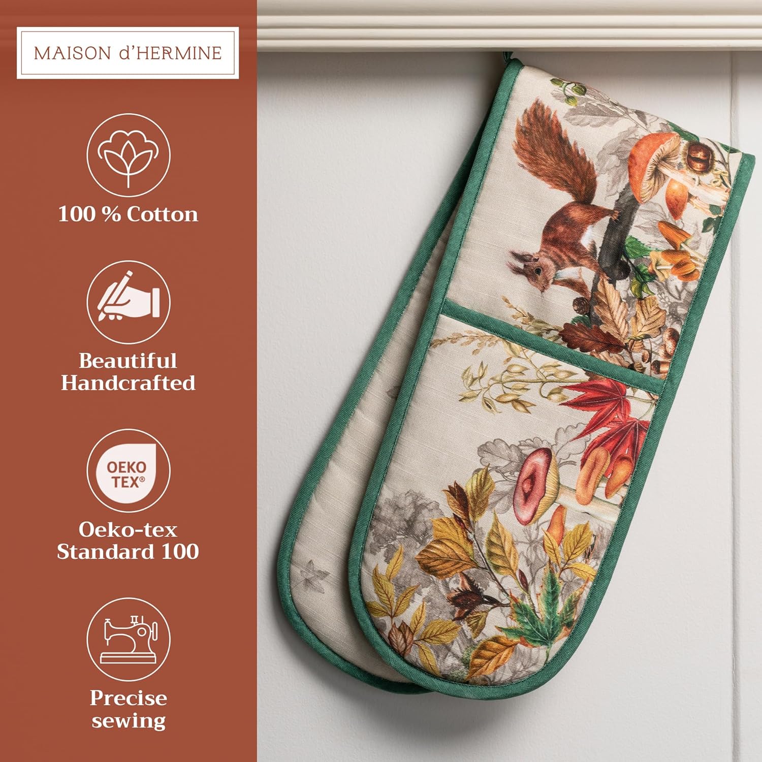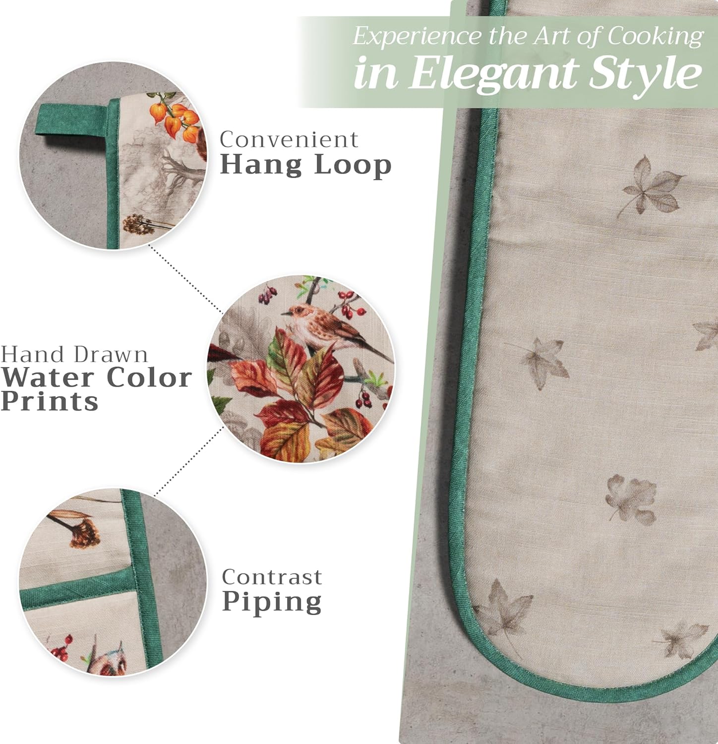 - Package includes: Includes 1 double oven mitt sized 7"x35". Perfect for handling hot cookware safely while adding a touch of European elegance to your kitchen. Designed in Europe and made in India with care