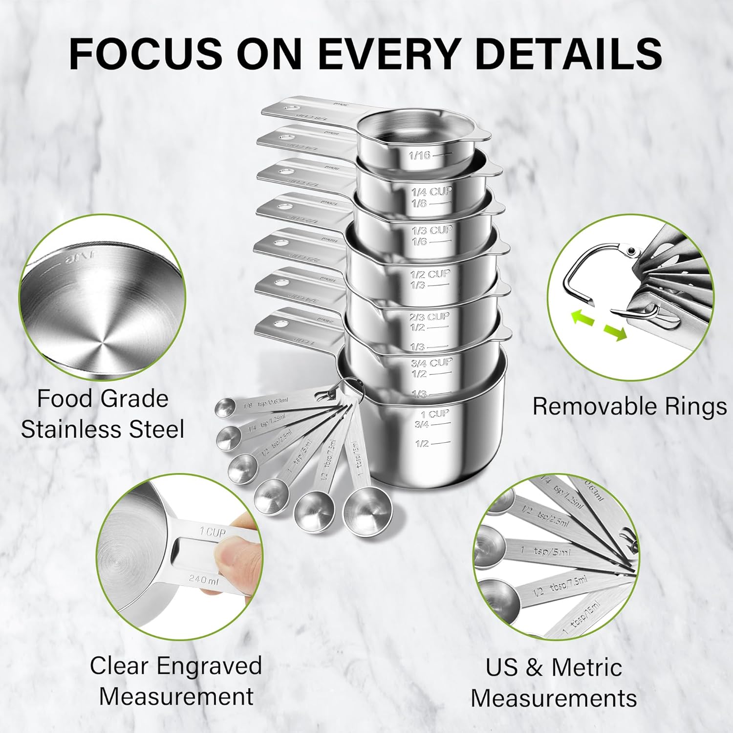 Vakoo 13-Piece Stainless Steel Measuring Cups and Spoons Set - Stackable & Nesting, U.S./Metric Dual Markings, Dishwasher Safe, Kitchen Gadgets for Baking & Cooking
