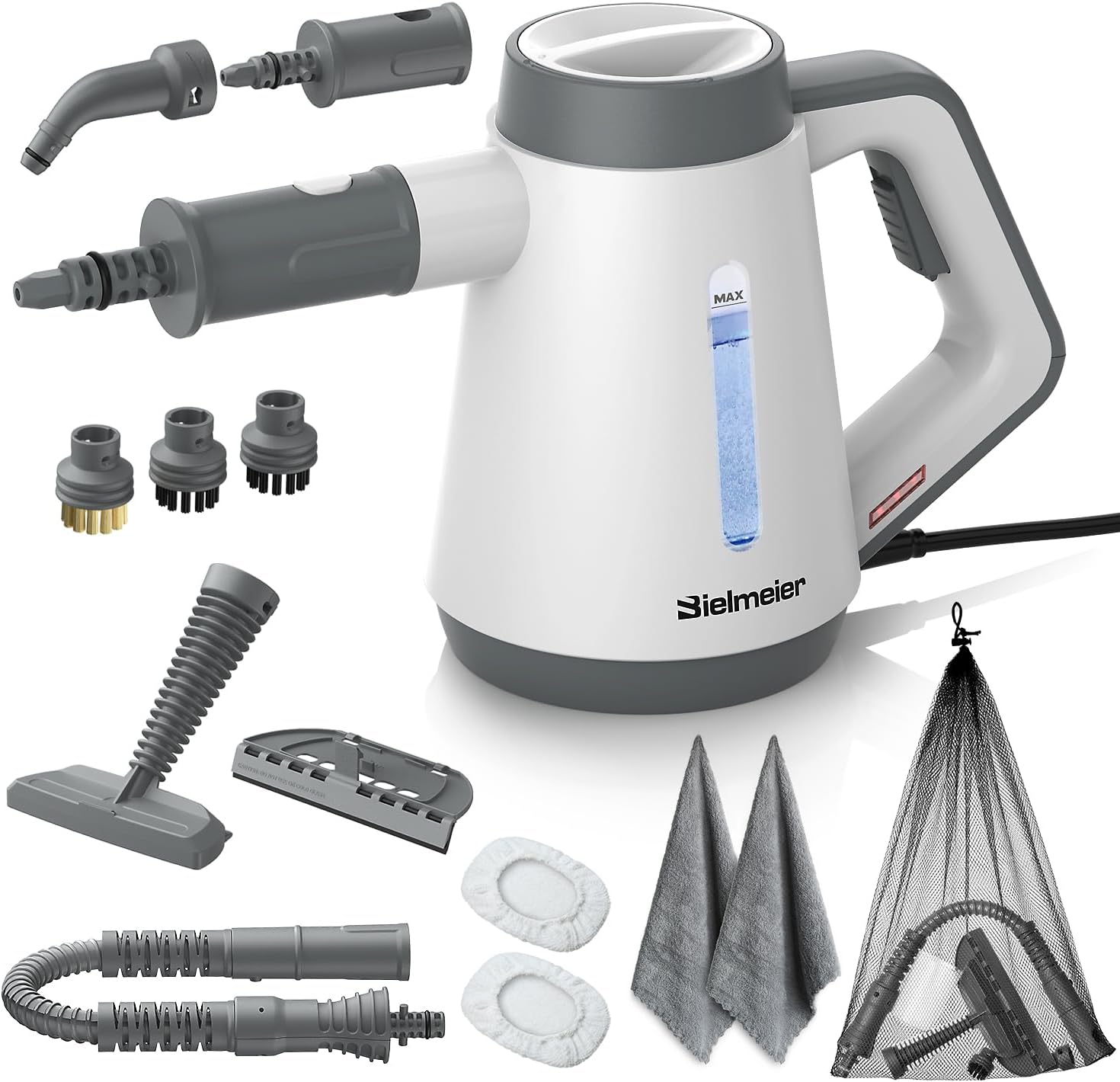 - Enjoy a user-friendly design with our mini steam cleaner. It includes a water level window for easy monitoring, a large lid, and a funnel-shaped water inlet for hassle-free refilling. Plus, it comes with a storage bag for all your accessories, enhancing your cleaning experience.