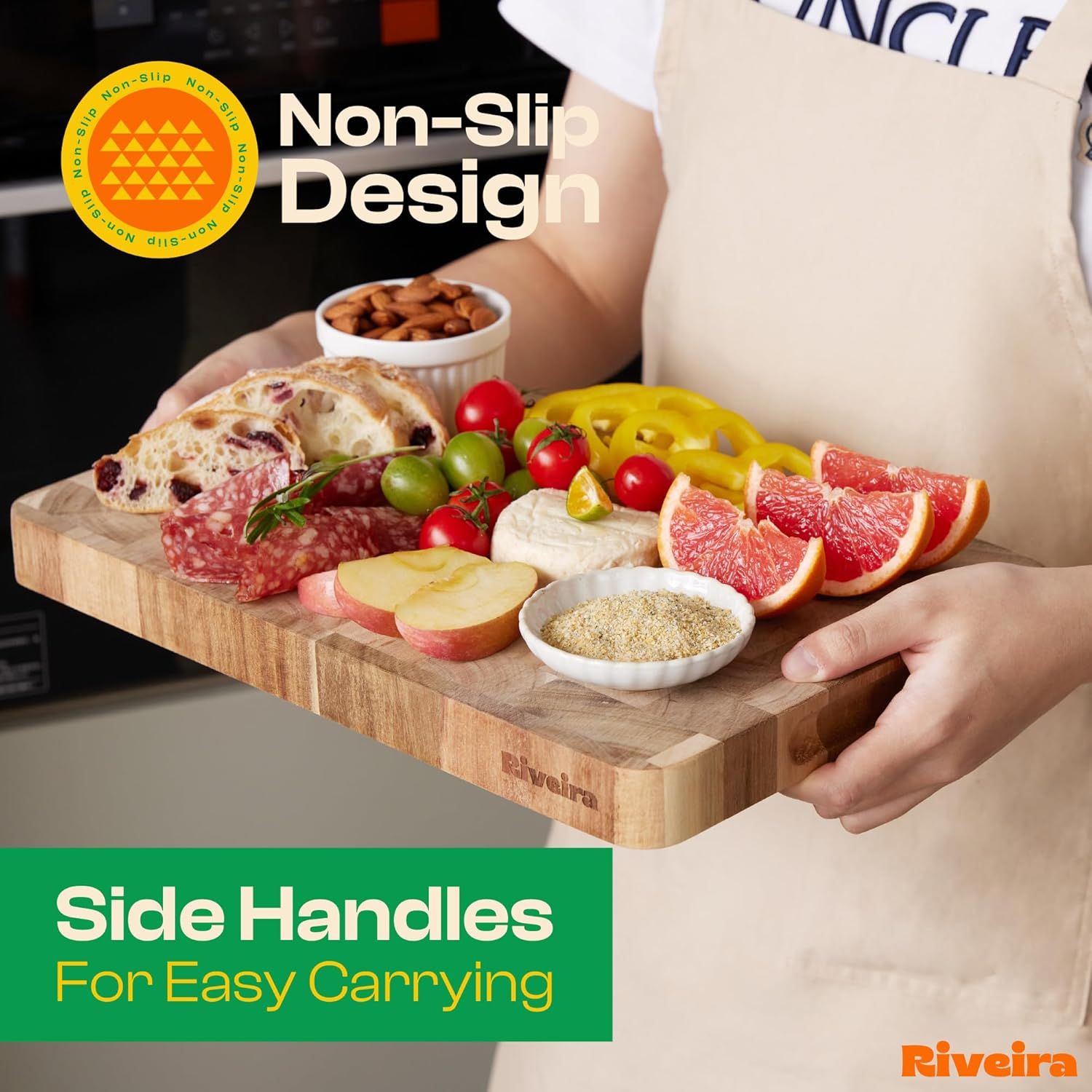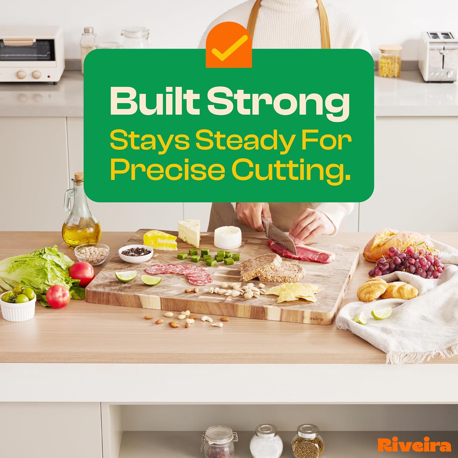 - Premium Crafted Acacia — Take a detour from traditional kitchen aesthetics with this acacia wood board crafted from 100% natural acacia. Beyond being an unconventional and eco-friendly choice, the chopping board wood proudly showcases the environment friendly and organic acacia. This wood cutting boards for kitchen counter adds an unexpected touch of confidence and style to your once-orderly culinary space. Riviera's wooden chopping boards for kitchen will be there for many years to come.
