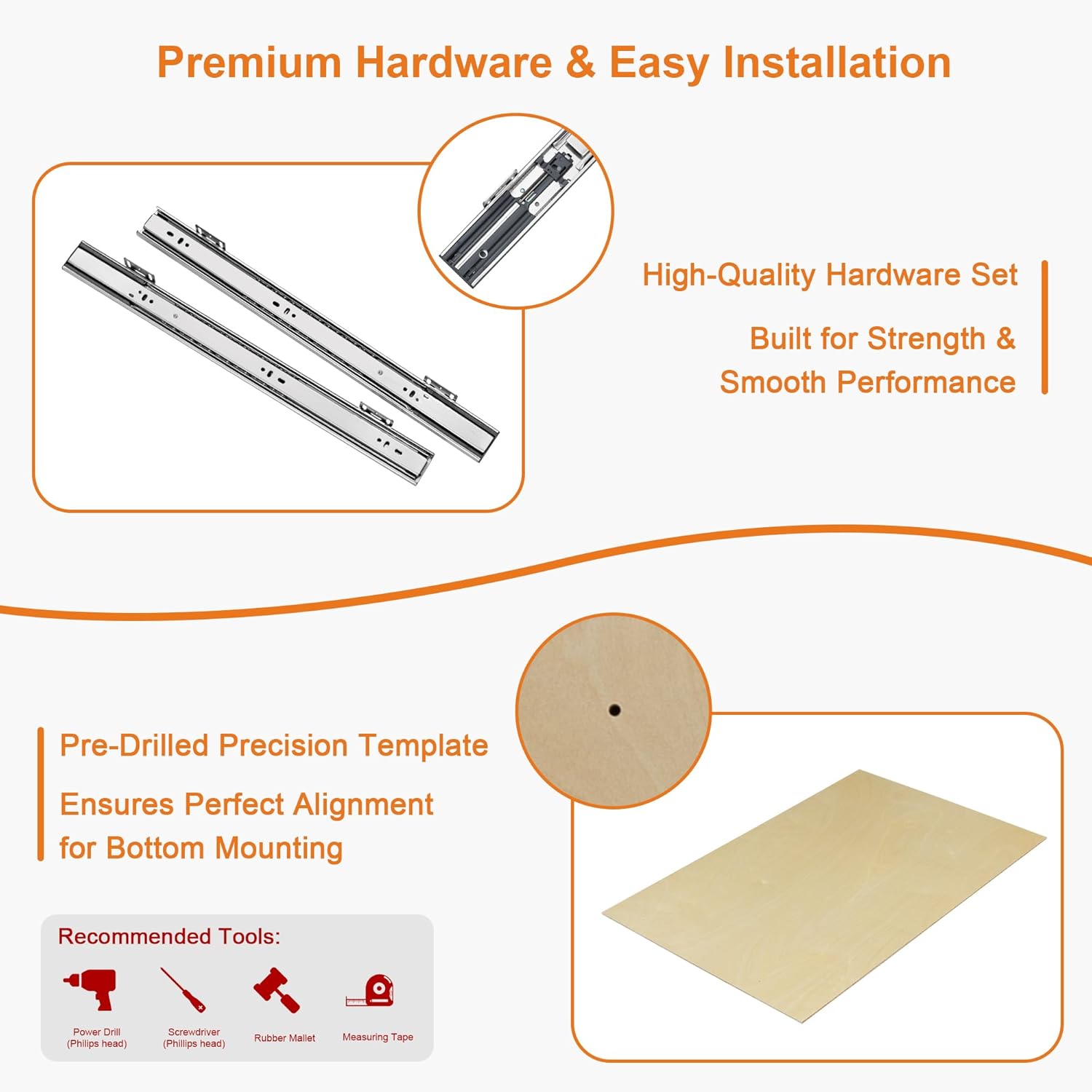 - Pre-Drilled Wood Template (Guide & Shim) - The included template measures 31-1/2"W x 22-1/2"D x 3/16" thick; for frameless cabinets, the opening must be ≥ 31-1/2" to use it untrimmed, otherwise trim the template edges to fit (and the template can also act as a thin shim to level a small lip)