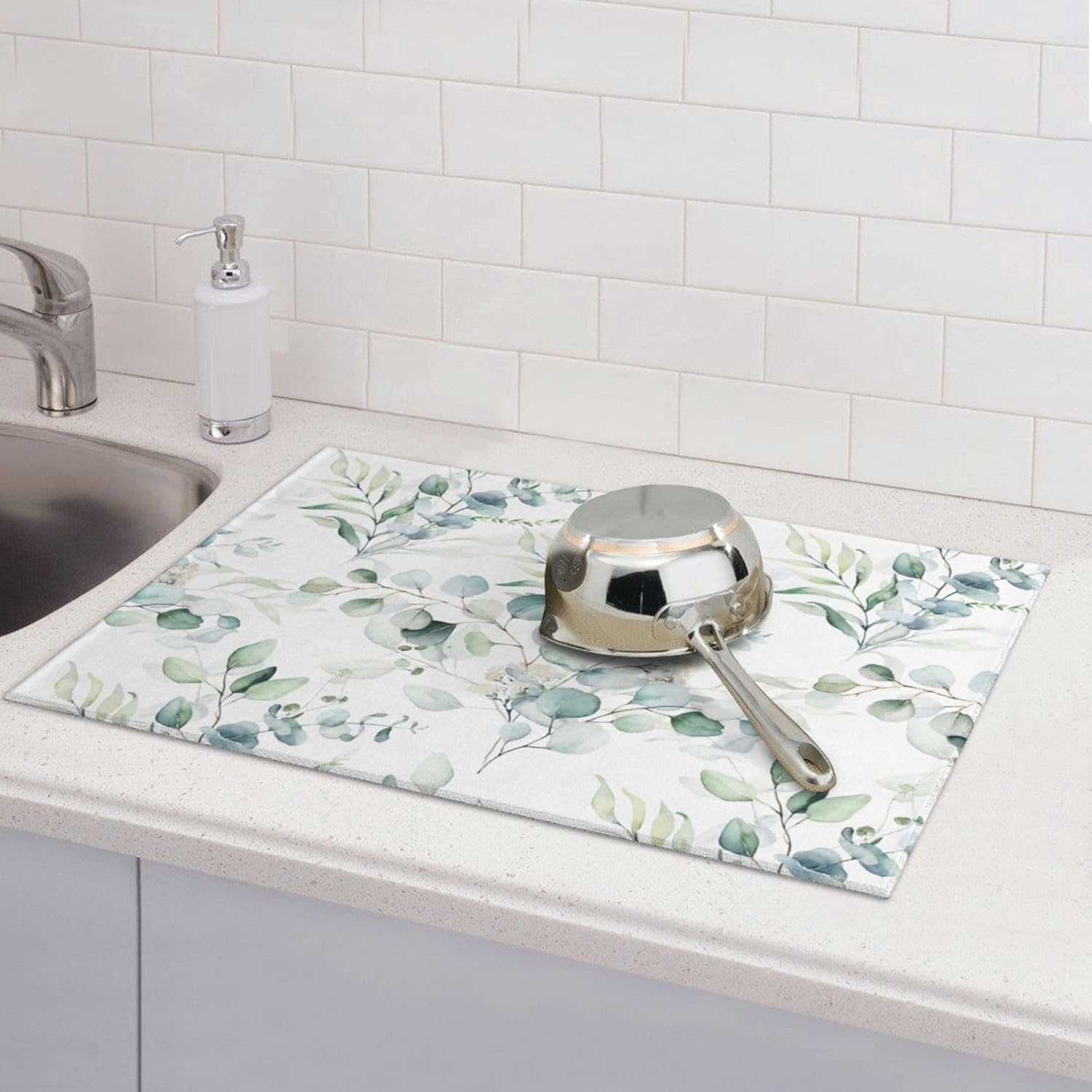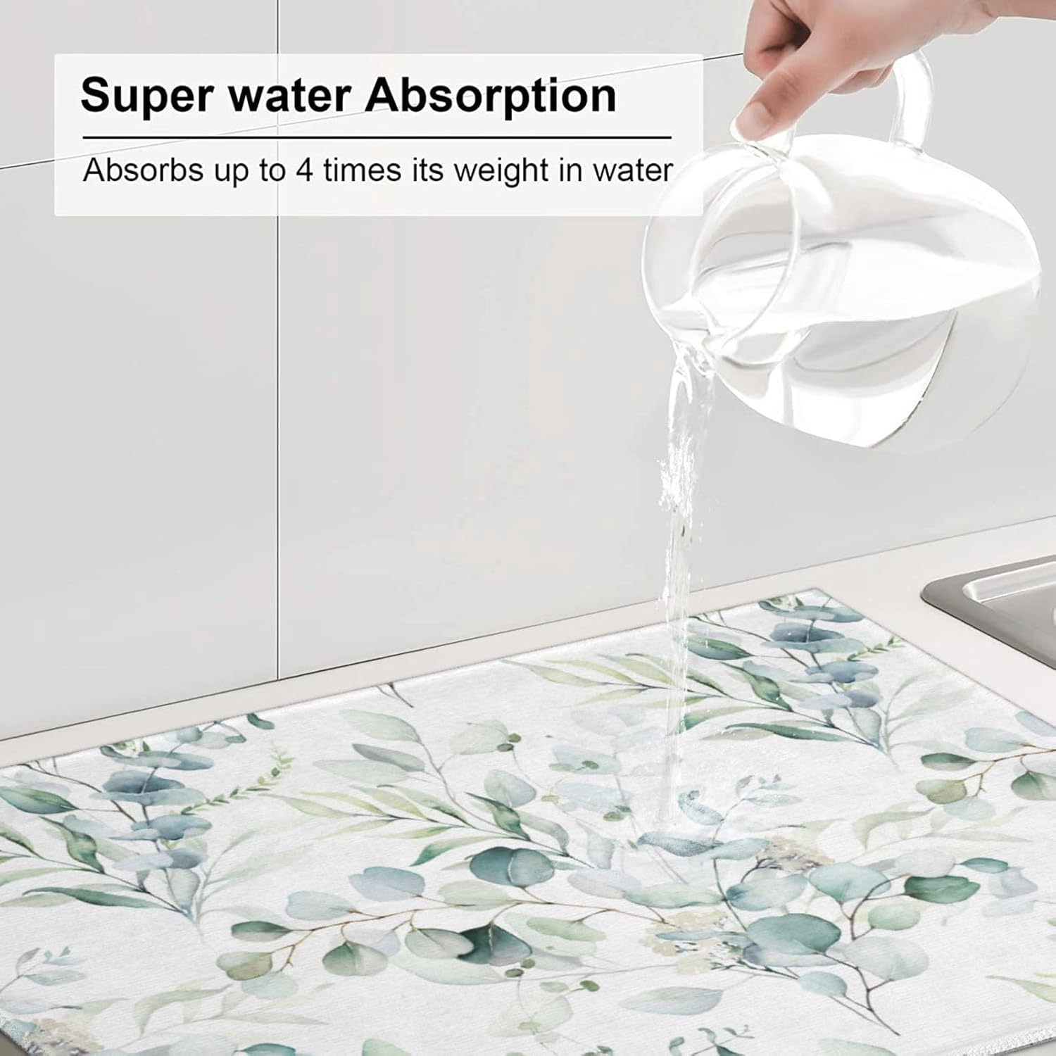 Sage Green Leaves Dish Drying Mat 18x24 inch for Kitchen Counter Watercolor Herbs Plant Kitchen Drying Mats Dishes Pad Absorbent Fast Dry Dish Draining Mats Large Kitchen Accessories