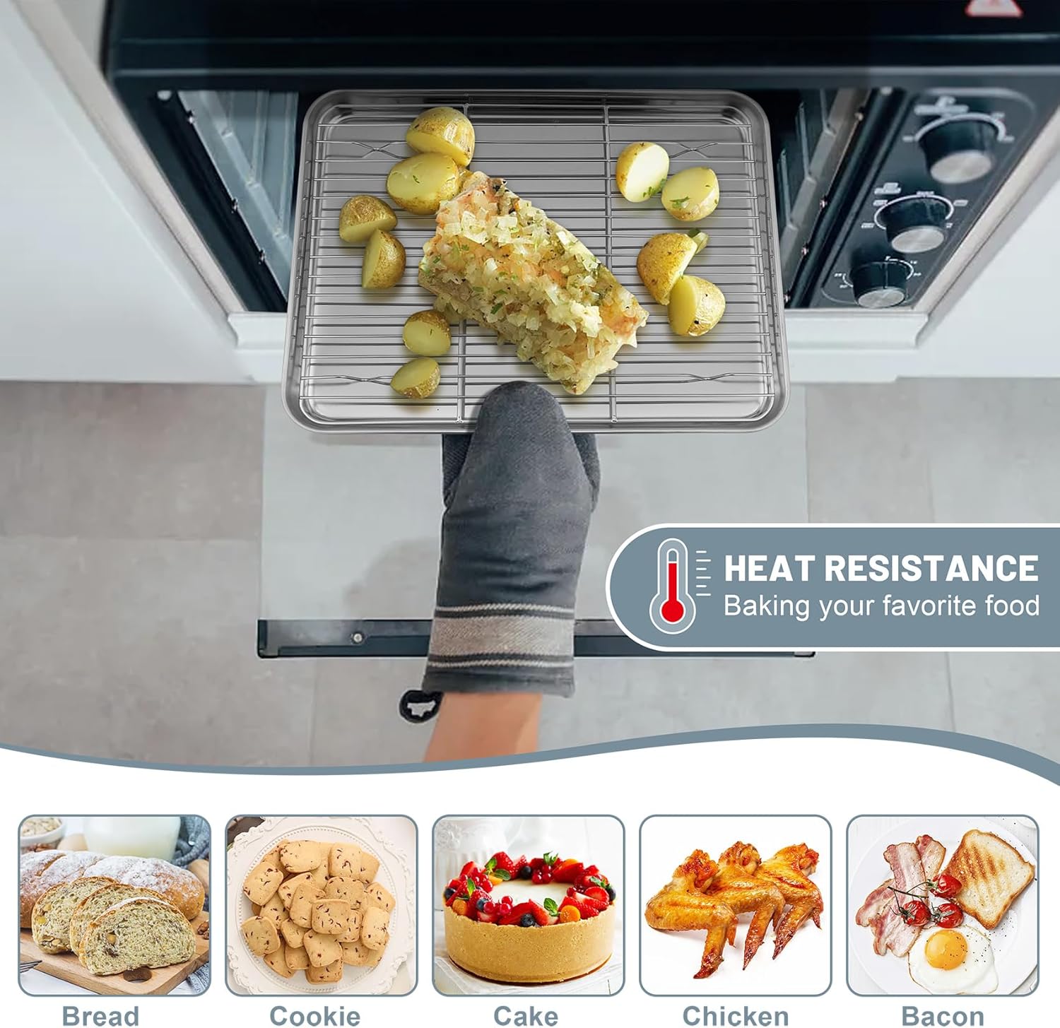 - SMOOTH DENSE WIRES & STABLE FEET: Dense parallel lines keep food from falling through the gap, Smooth edges with no roughness ensure comfortable to grip and transfer, The feet are all curved and the baking racks will not scratch the surface when placed on the small oven pan and countertop
