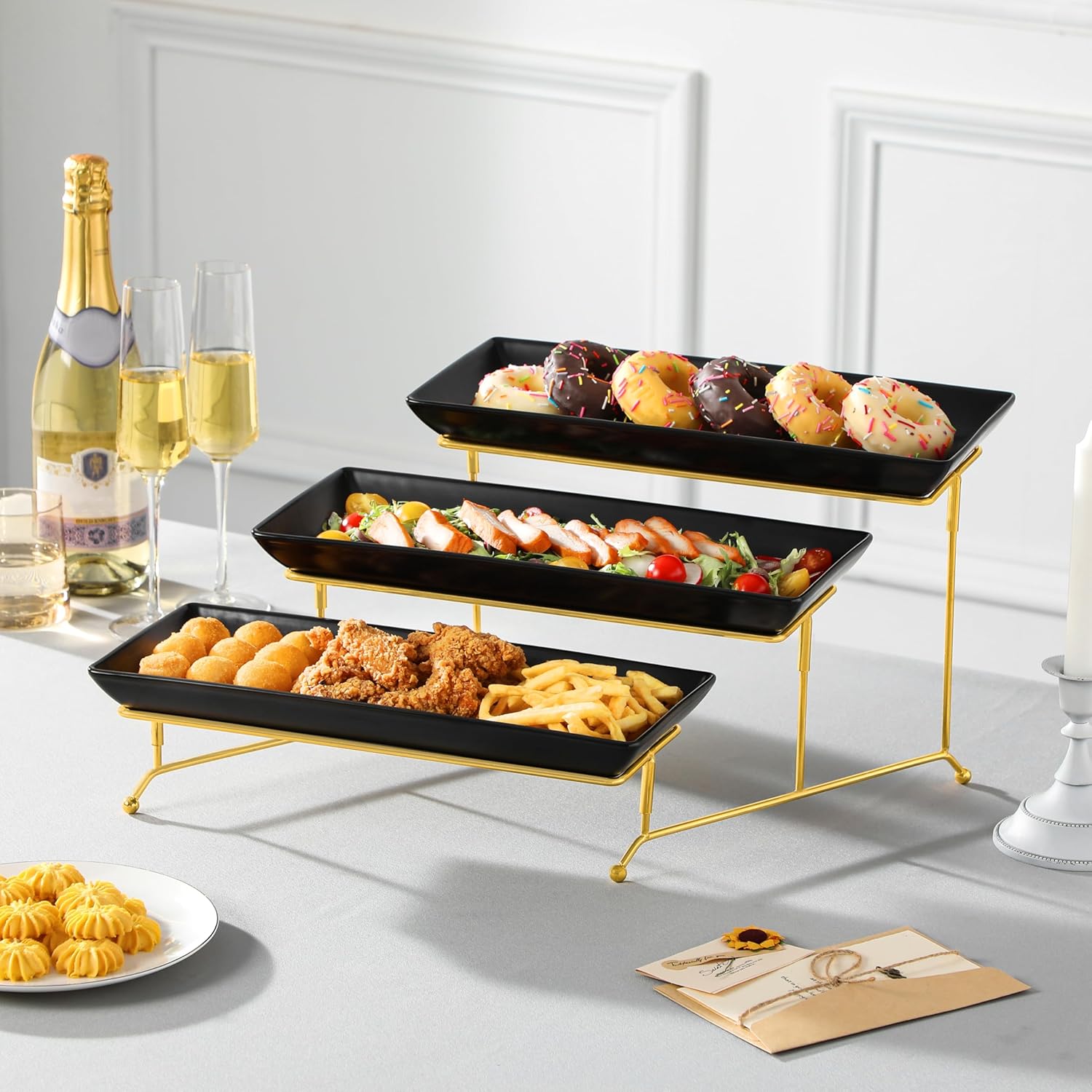 MALACASA 3 Tier Serving Trays for Party, 14 Inch Porcelain Black Trays for Serving Food, Dessert Stand with Collapsible Gold Metal Rack