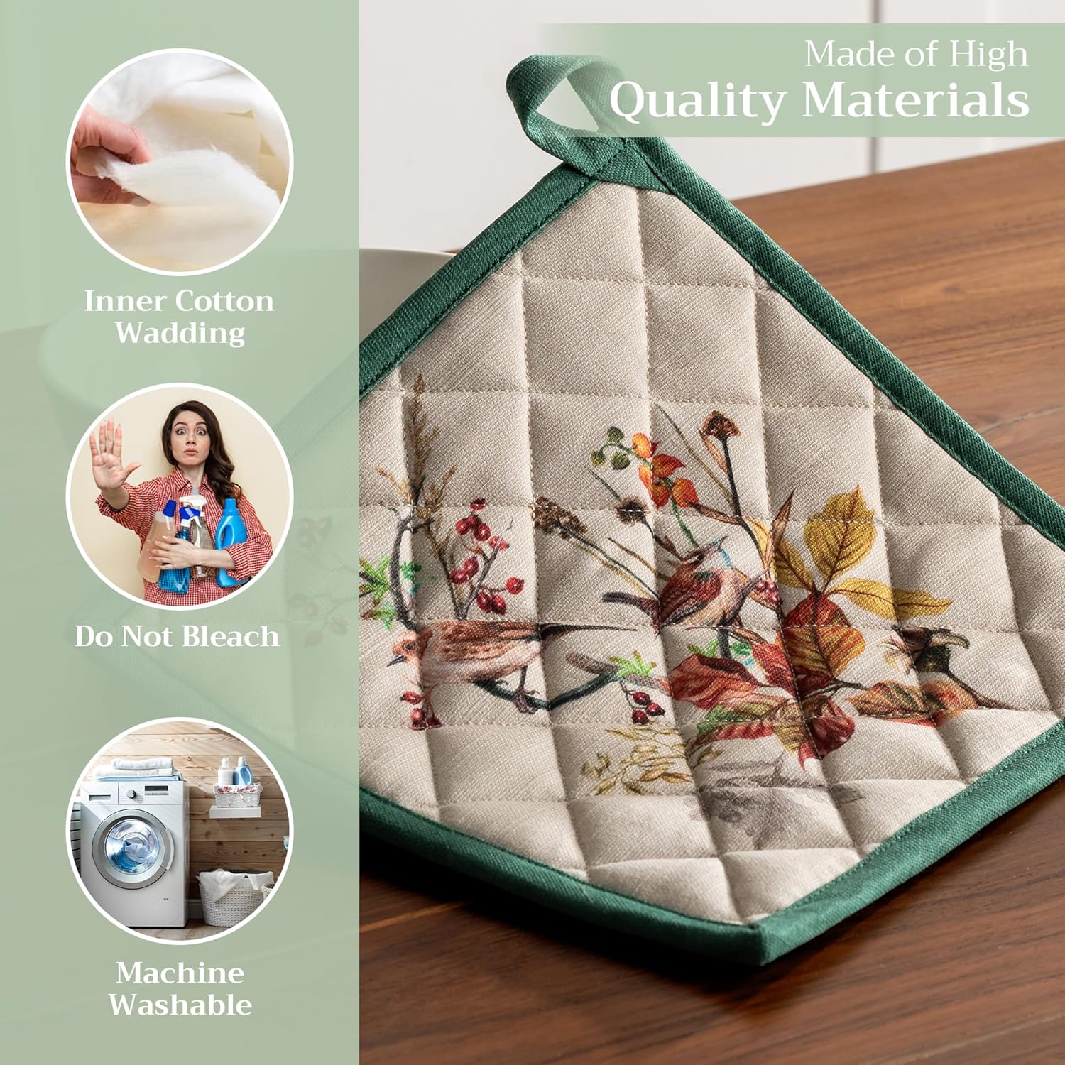 - 100% Quilted cotton: Made from premium quilted cotton, our pot holder ensures safe handling of hot pans or dishes. The soft, durable build provides excellent heat resistance and grip—perfect for everyday cooking and baking needs