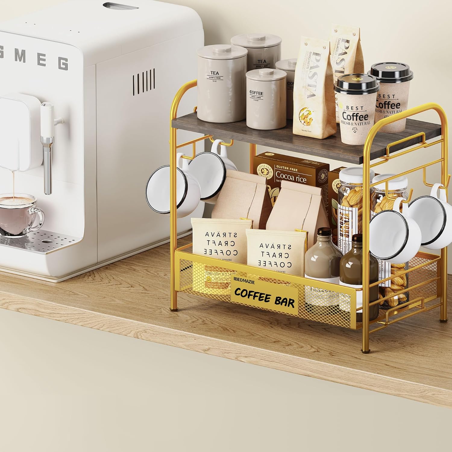 - 【2 Tier Large Storage Space】The coffee mug organizer with 2-tier design has a large capacity. The top layer is wood,Flat and sturdy. the second layer can easily store and access to all the coffee set, It is a good combination of mug holders and coffee bar organizers to maximizing space saving