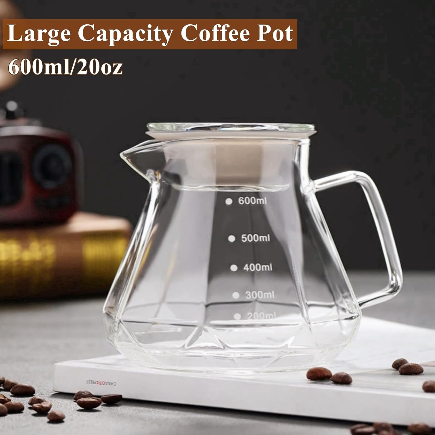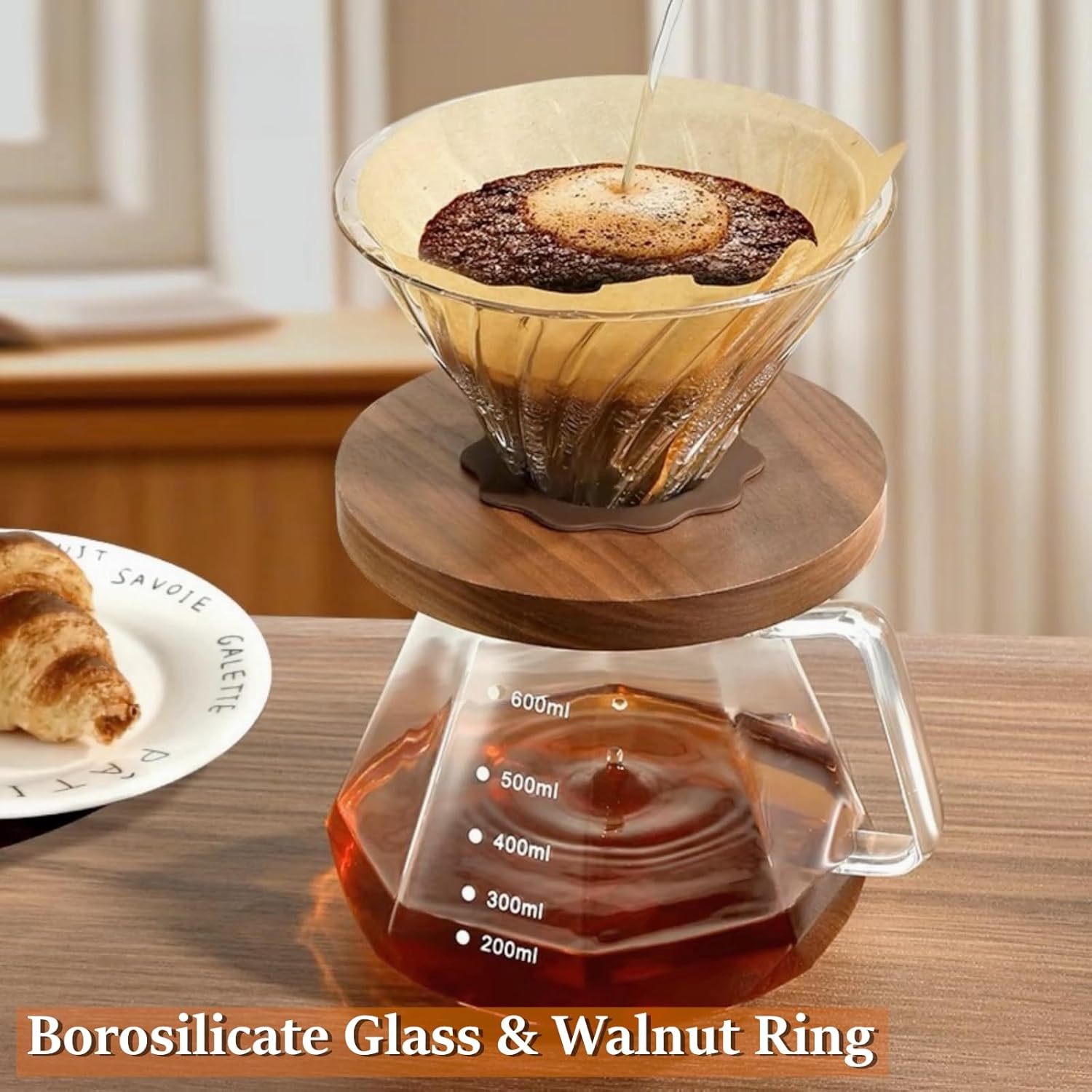 Pour Over Coffee Maker Set 20 oz, 600 ml Borosilicate Glass Coffee Server with Glass Lid, 50 pcs Paper Filter, Walnut Handle Pour Over Coffee Dripper for Home Café Restaurant, Clear