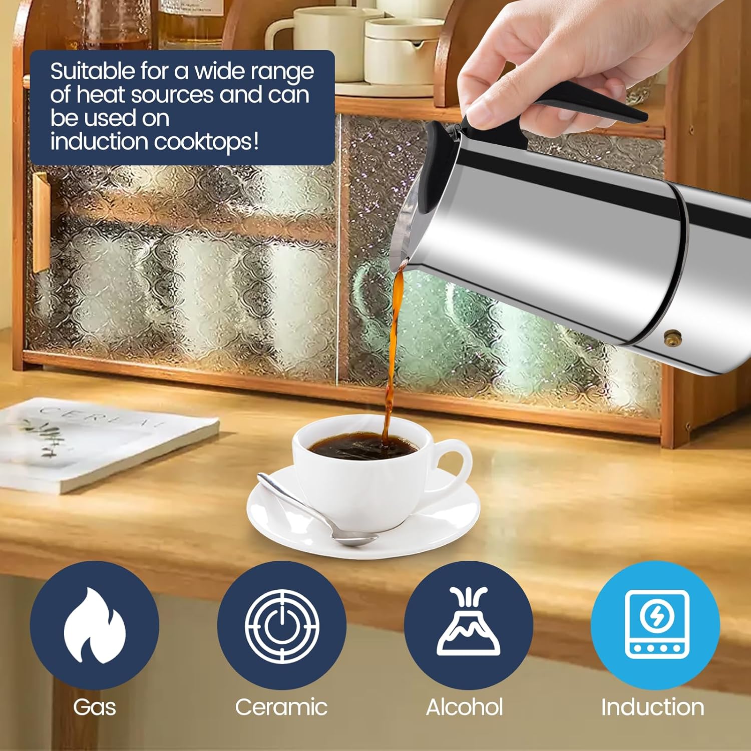 - Trustworthy: Stainless steel moka pot is induction safe and very strong and durable. Crafted with semi-handmade craftsmanship, every detail is carefully polished for superior quality