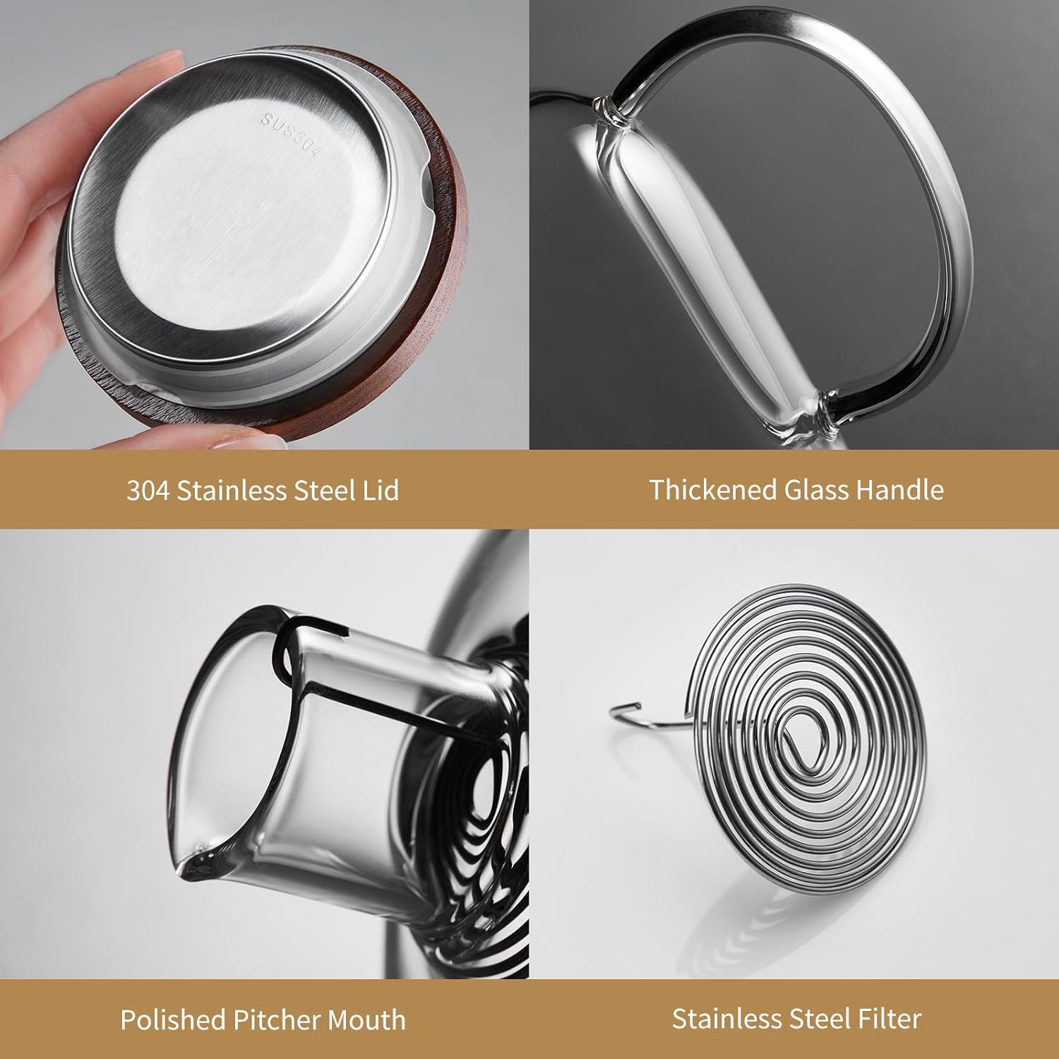 - High Borosilicate Glass: The water pitcher is made of heat resistant Borosilicate glass and can withstand temperatures -4 to 302 degree F, so you can also use it to hold and dispense hot and cold liquids safely than other materials. Drinking from glass tastes better, so get rid of your dingy plastic pitchers and enjoy a better tasting beverage with our water carafe. The glass pitcher with lid doesn't stain, and won't absorb odor or color, can ensure years of use.
