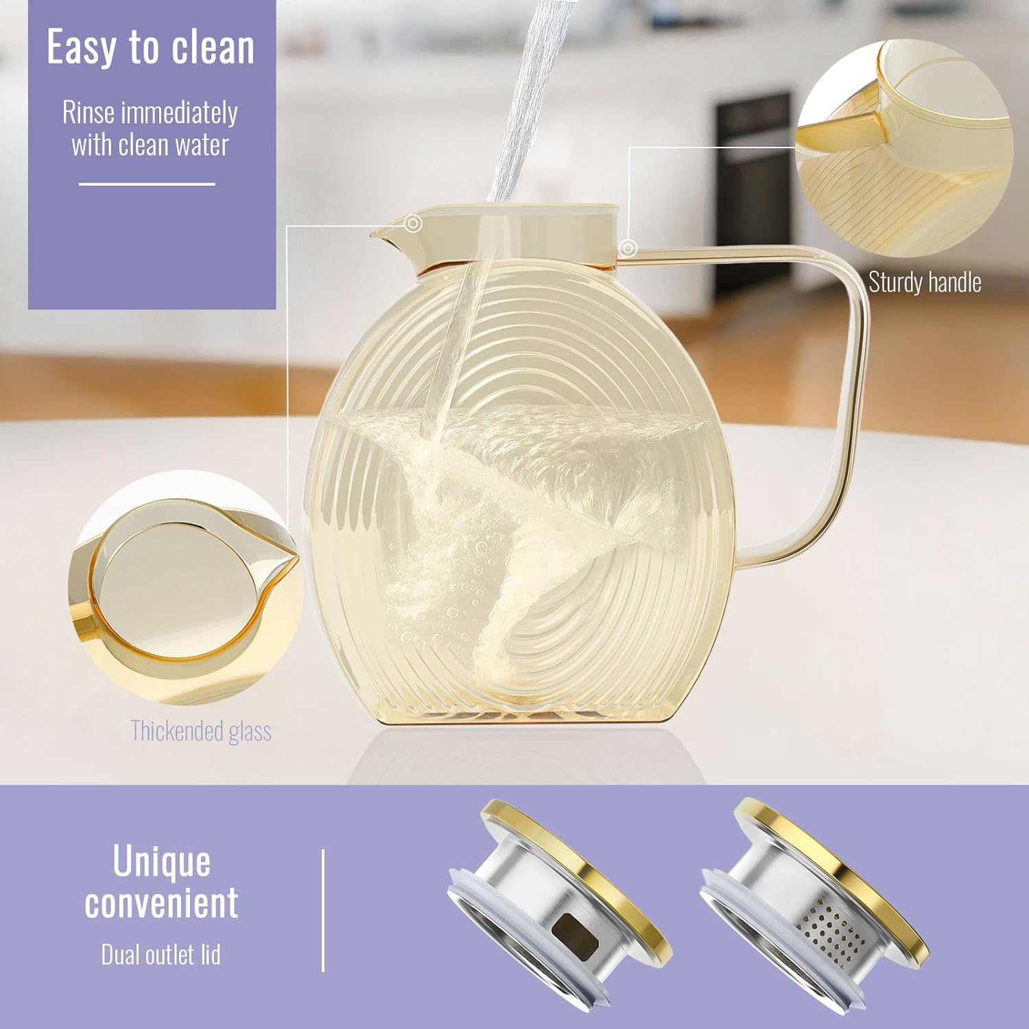- Important Note: Please remember to peel off the two layers of protective film from the golden lid before using your glass pitchers to ensure a pristine and enjoyable experience.