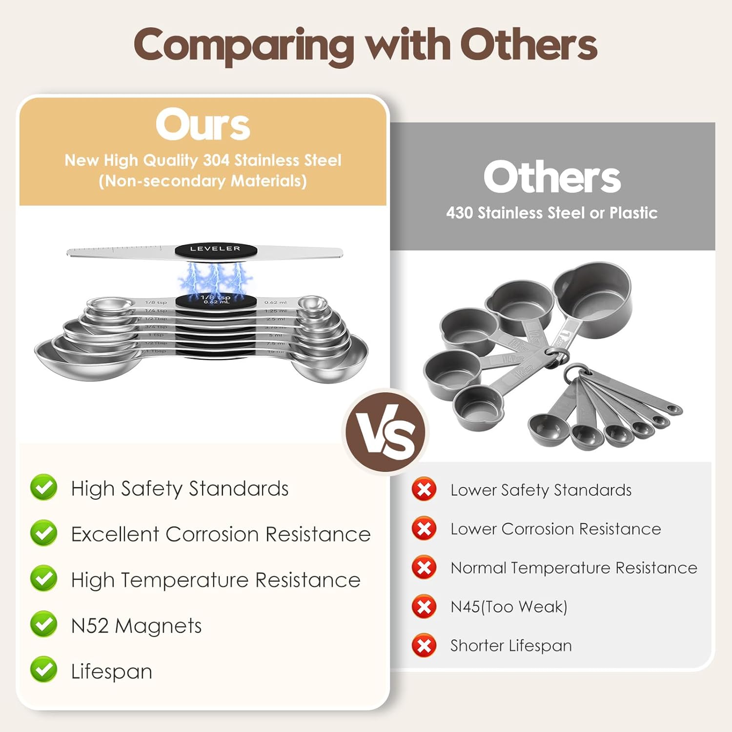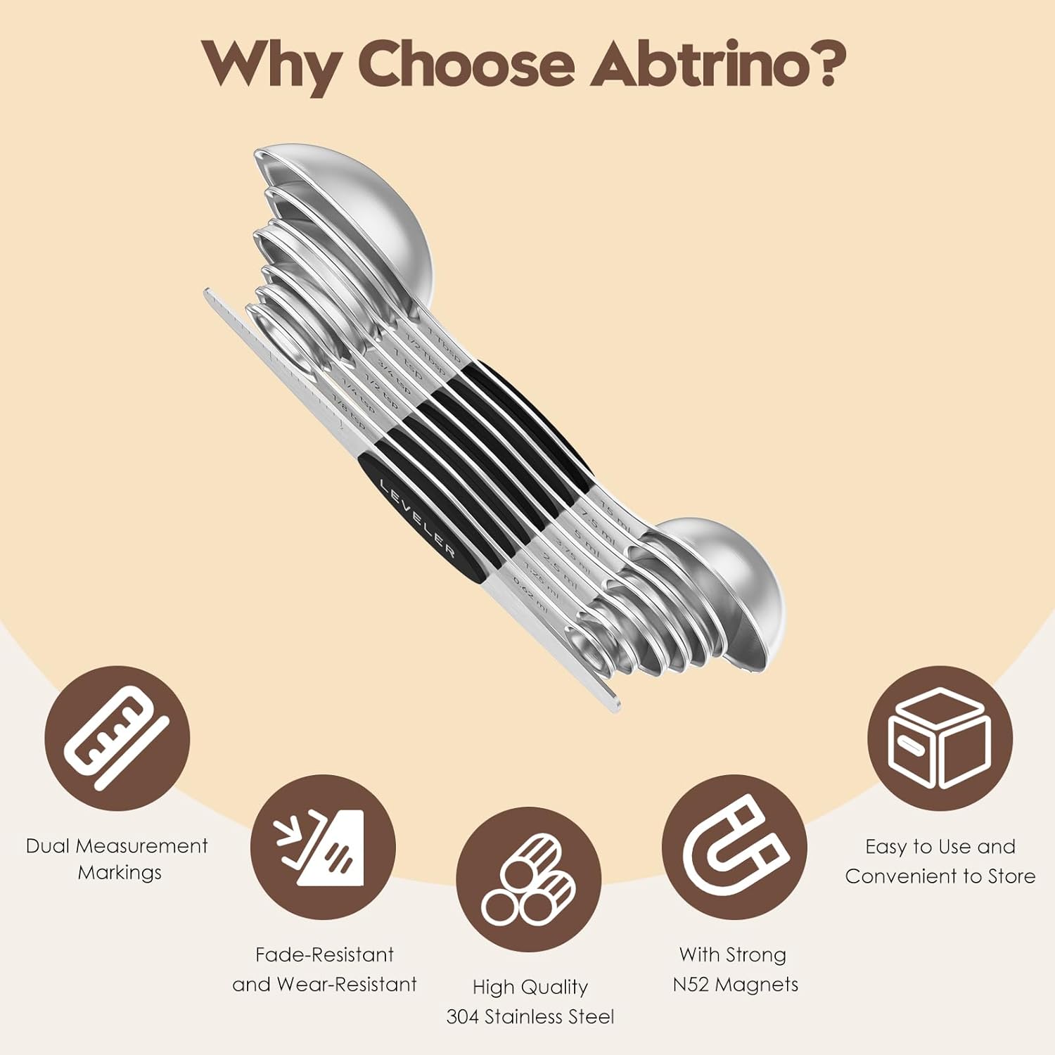 - Premium Quality & Built to Last: Crafted from heavy-duty 304 stainless steel, Abtrino measuring spoons resist rust and wear, ensuring long-lasting performance. Our EXCLUSIVE triple-marking magnetic measuring spoons set combine durability with vibrant colors. Compare the value, experience, and attention to detail - we’re confident you’ll notice the difference. It’s crafted to add both style and function to your kitchen, making it an ideal choice for both home cooks and professional chefs.