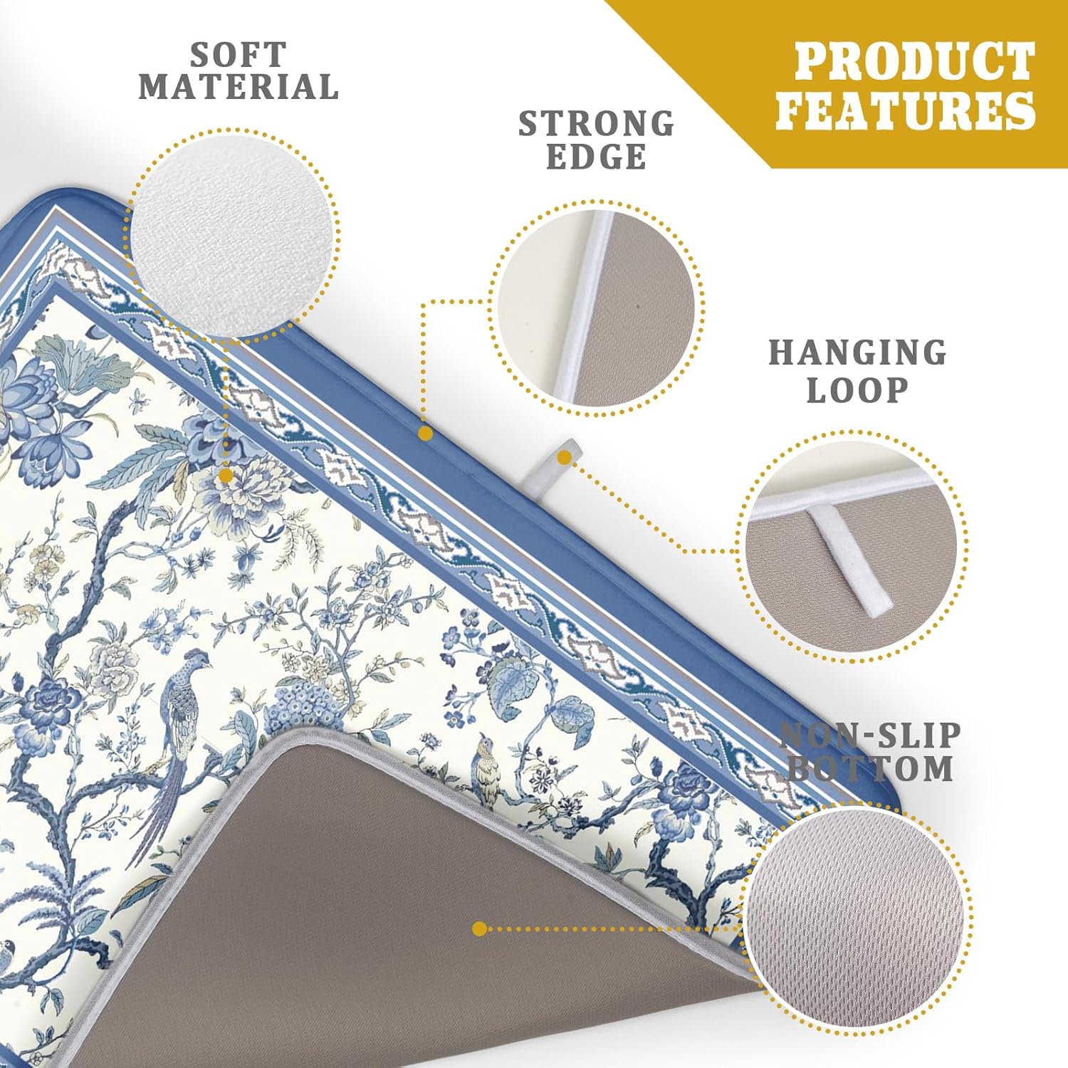 Giwawa Chinoiserie Dish Drying Mat 18x24in Blue White Oriental Floral Birds Kitchen Drainer Mats Porcelain Flowers Absorbent Microfiber Dish Drying Pad Large for Countertop Home Decor