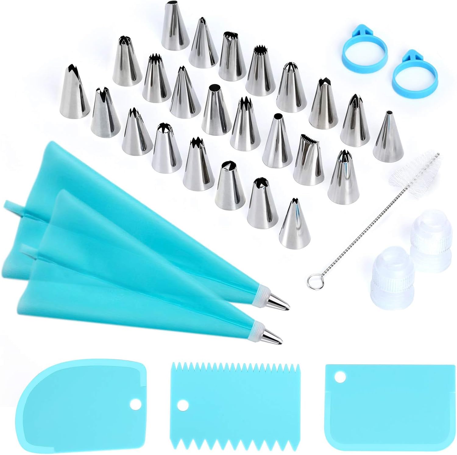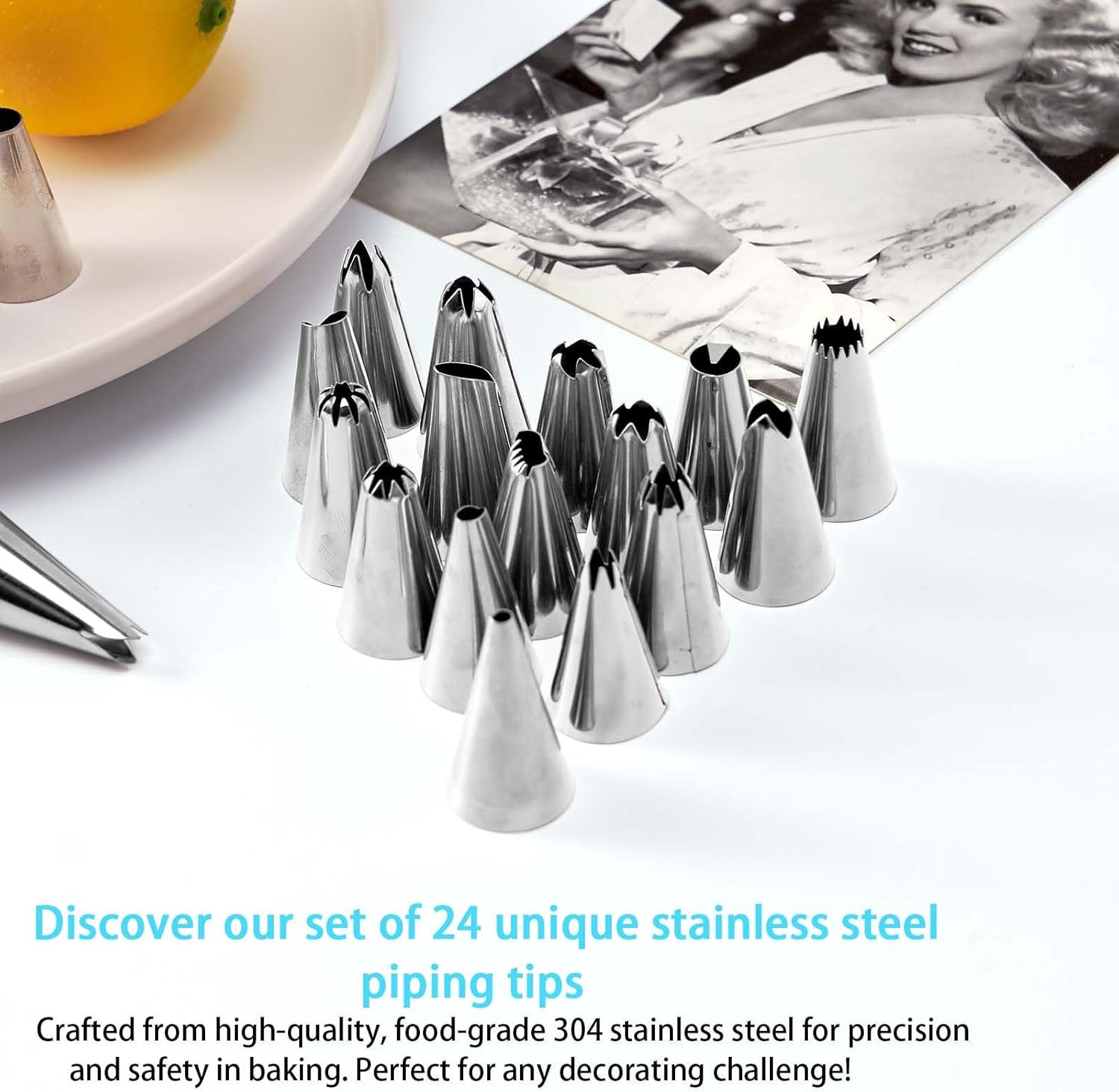 - 🎂【COMPLETE DECORATING SET】:This set includes 24 stainless steel icing tips, 2 reusable silicone pastry bags in different sizes, 2 plastic couplers, 3 scrapers, 2 frosting bag ties, and 1 cleaning brush. These cake decorating supplies provide all the essential tools to create a variety of stunning cake designs