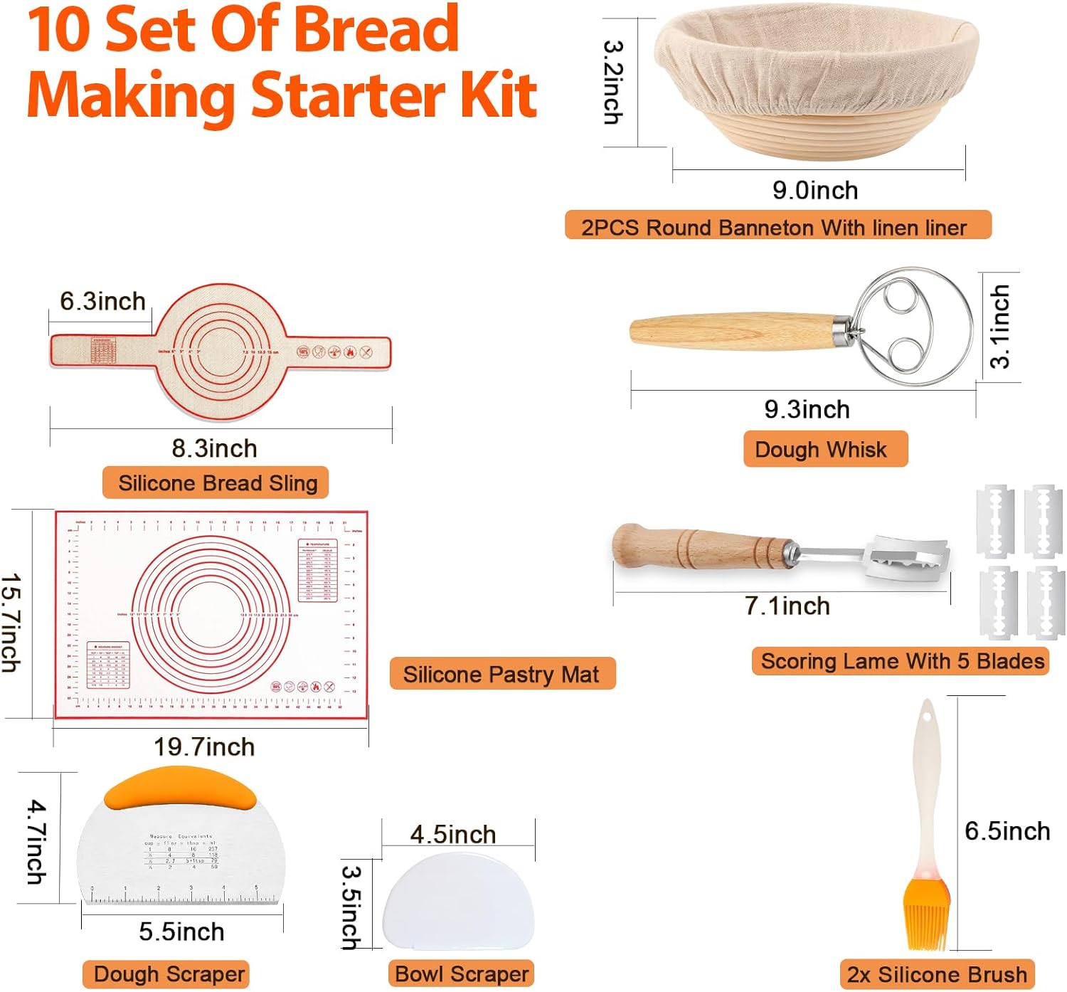 - Complete Bread Making Starter Kit: Our banneton bread proofing basket set includes 2pack 9 inch round basket with liner, a bread scoring lame with 5 blades and a leather cover, a stainless steel dough cutter, a silicone bread sling, Silicone Mat,a Danish whisk, a plastic dough scraper, and 2pcs free silicone brushes.