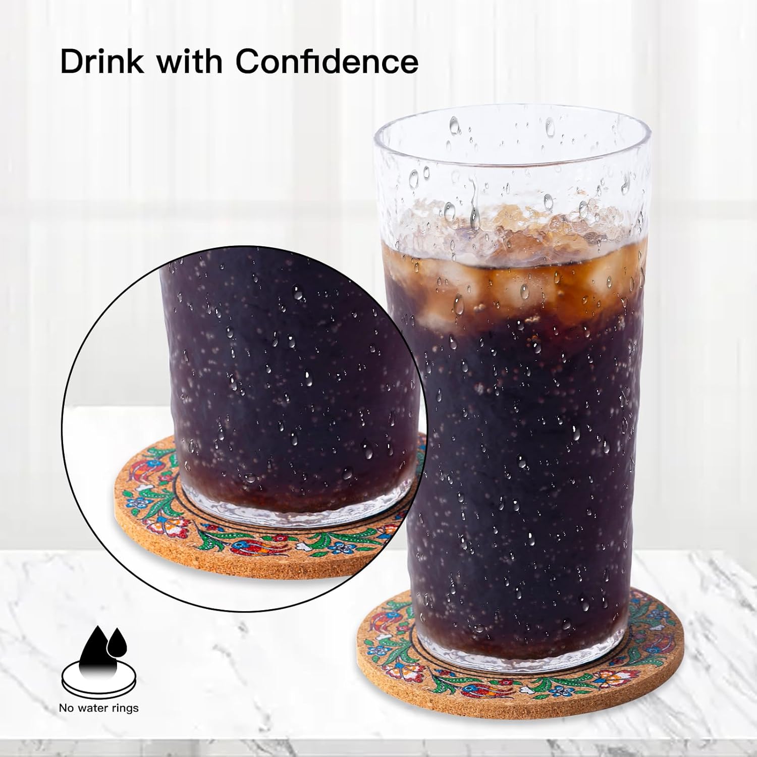 - What's in the box: Our coasters for drinks absorbent set includes 12 round cork coasters. The coaster is 10cm in diameter and 0.5cm in thickness. 6 patterns to choose from to make a beautiful addition to any room’s decoration